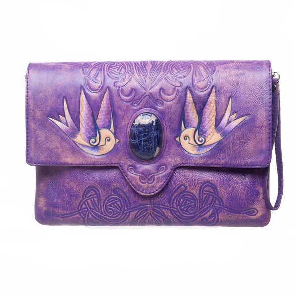 การออกแบบรูปนกนางแอ่นสีม่วงโบราณด้วยมือและวาดด้วยมือล้อมรอบหินไพฑูรย์ขนาดใหญ่