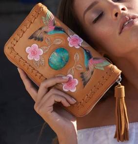 กระเป๋าสตางค์ลายนกฮัมมิงเบิร์ดแมลงปอและดอกซากุระวาดด้วยมือ