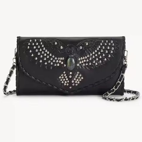 Hand-tooled Silver studded Owl Design Surrounds a Labradorite Stone on Hand-painted Black Cow Leather