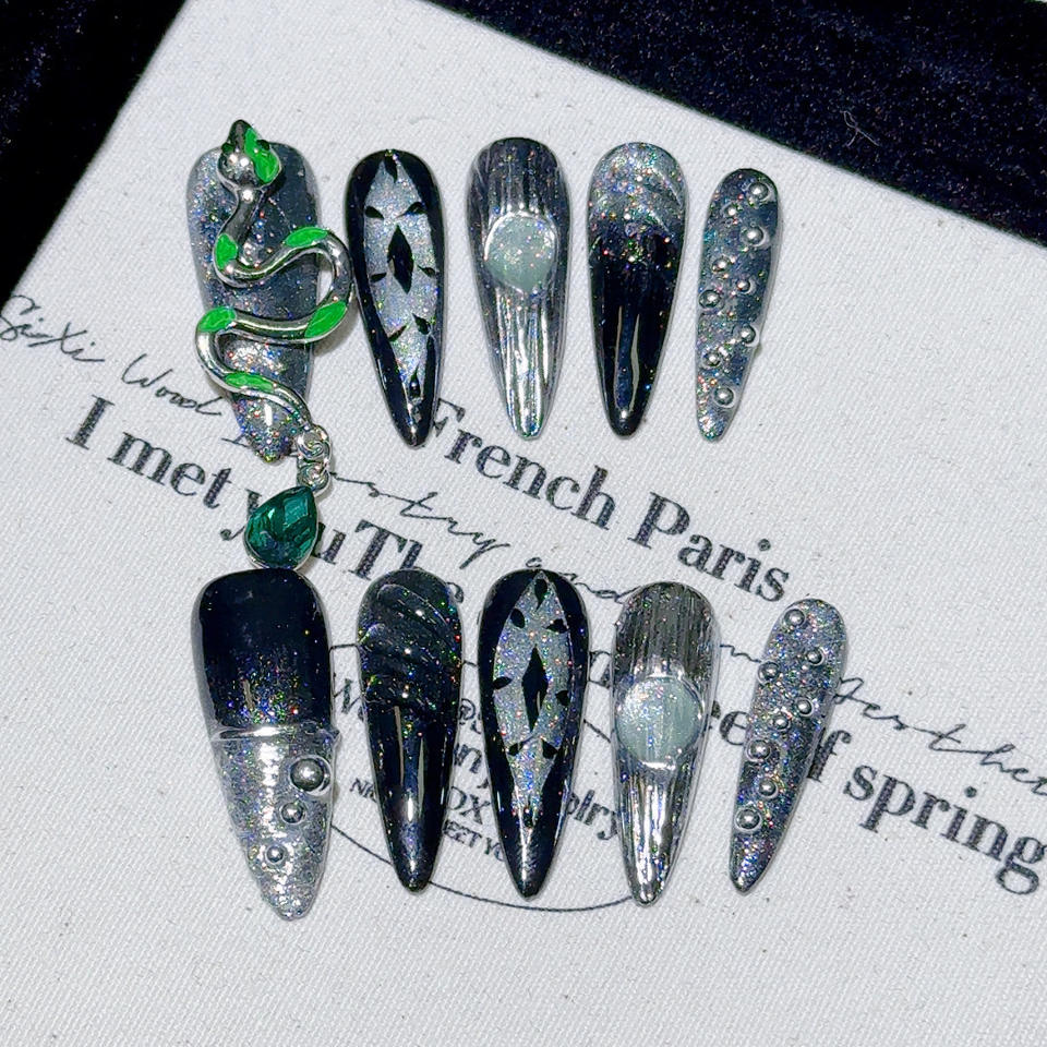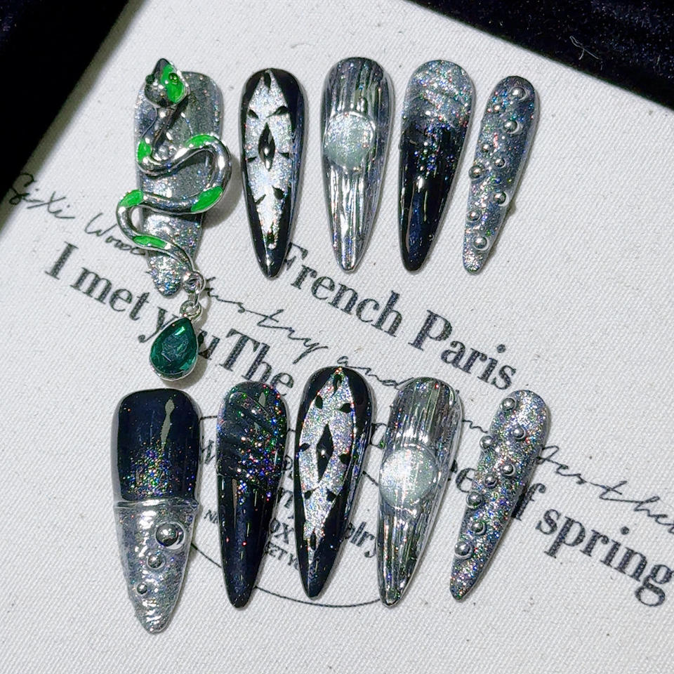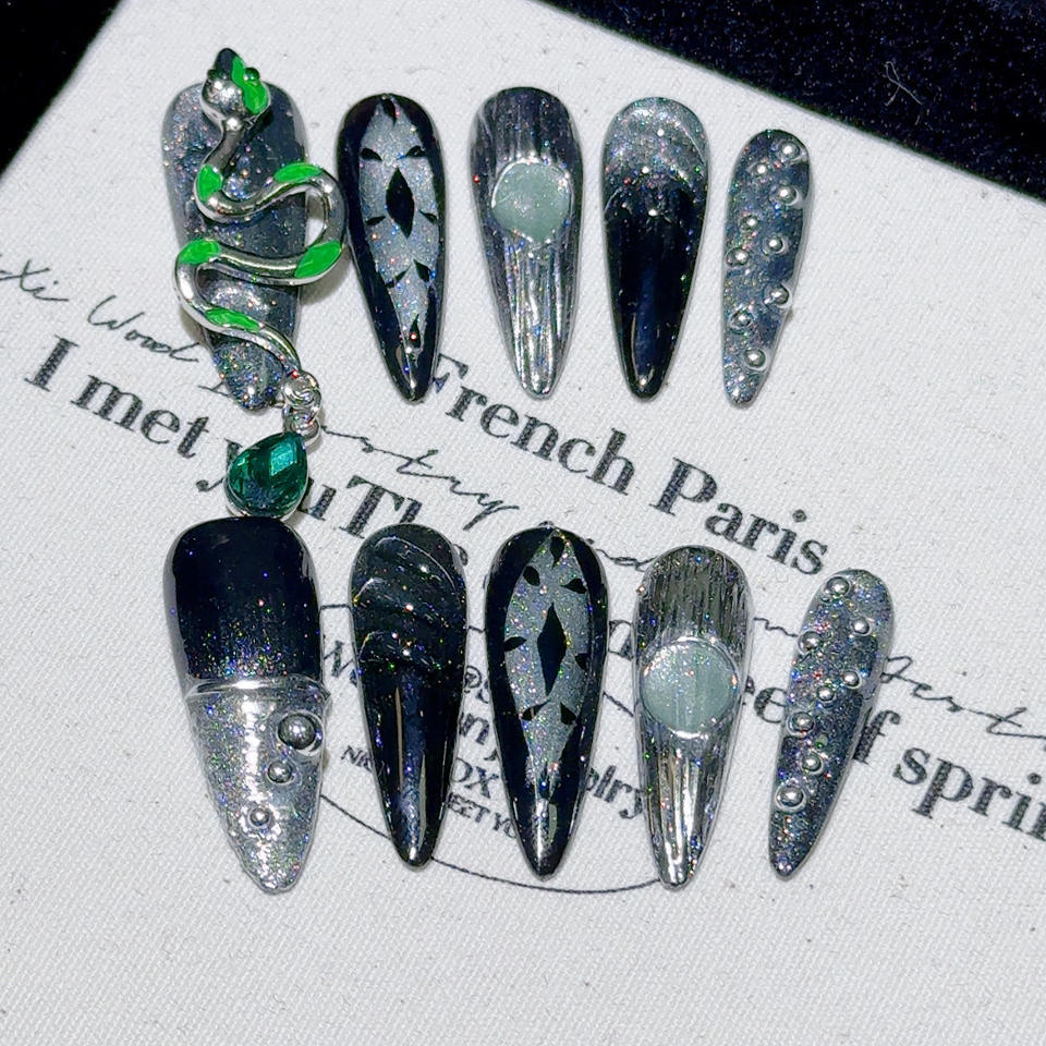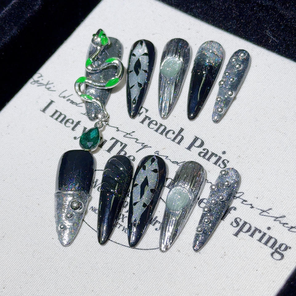 แผ่นติดเล็บเรซิ่นลายเกราะแบบสวมใส่ได้ ดีไซน์ยาวแหลมสีเข้ม ลายตาแมว สไตล์สลิธีริน พังก์ เมทัล ลายตาปีศาจ ได้รับการรับรองมาตรฐาน CE สินค้าหรูหรา
