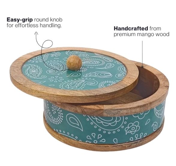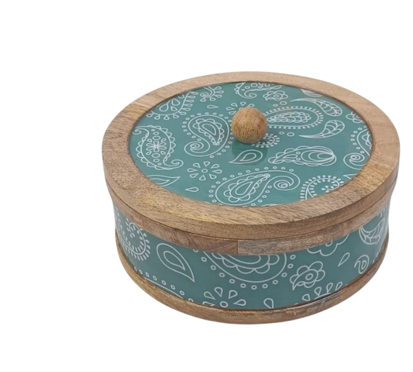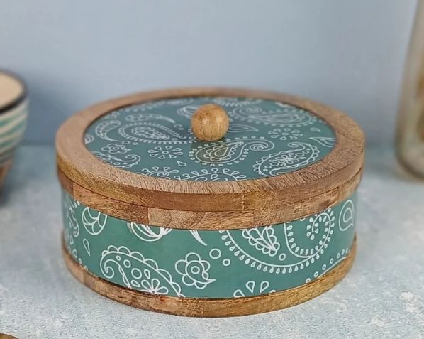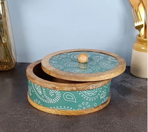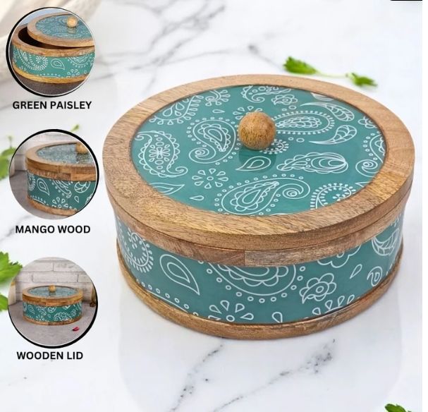 กล่องเก็บชามไม้มะม่วงลาย Paisley สีเขียวทำด้วยมือกล่องอุ่นหม้อปรุงอาหารสำหรับตกแต่งบ้านในห้องครัว