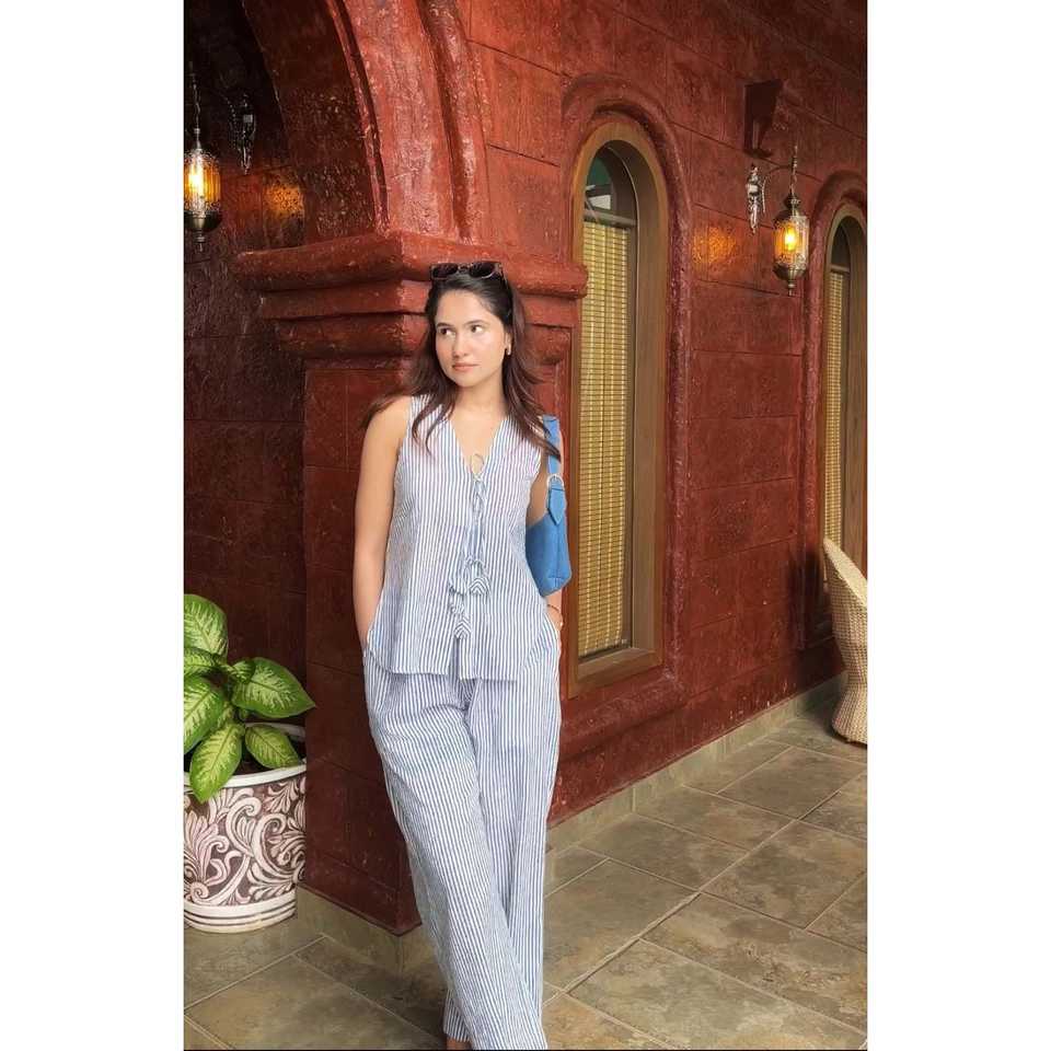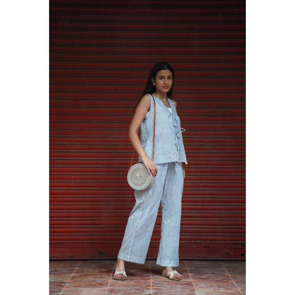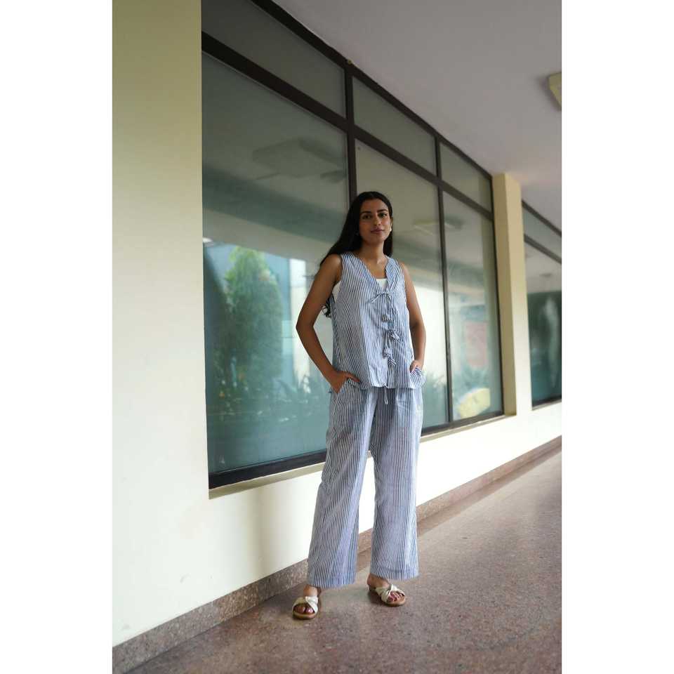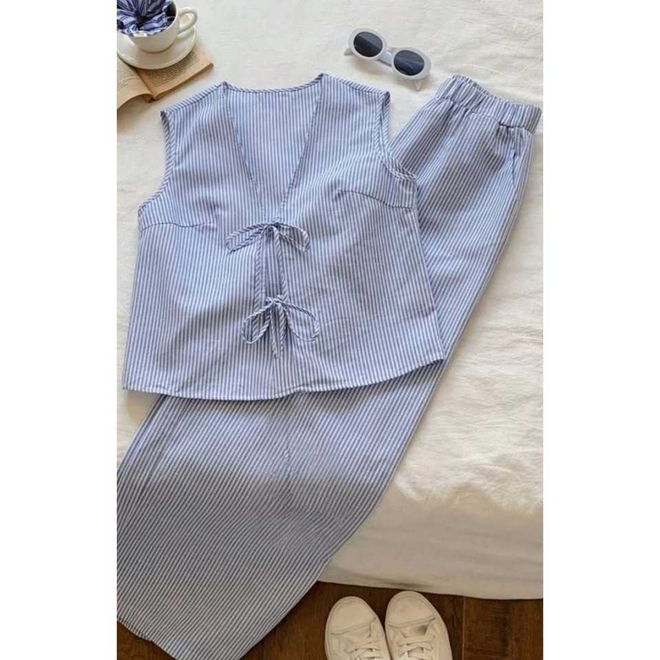 ชุดเซ็ตสองชิ้นสไตล์เสื้อกั๊กผูกเอว ผ้าออกซ์ฟอร์ดระบายอากาศ ลายทางสีน้ำเงิน ปักลายด้วยมือสำหรับผู้หญิง คอวี แขนกุด สวมใส่สบาย ความยาวระดับเข่า