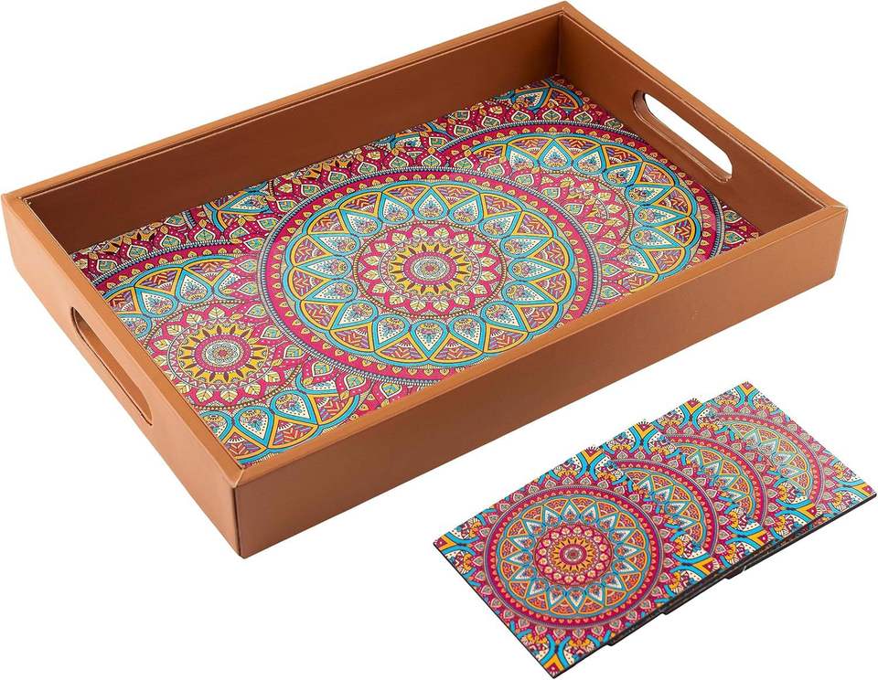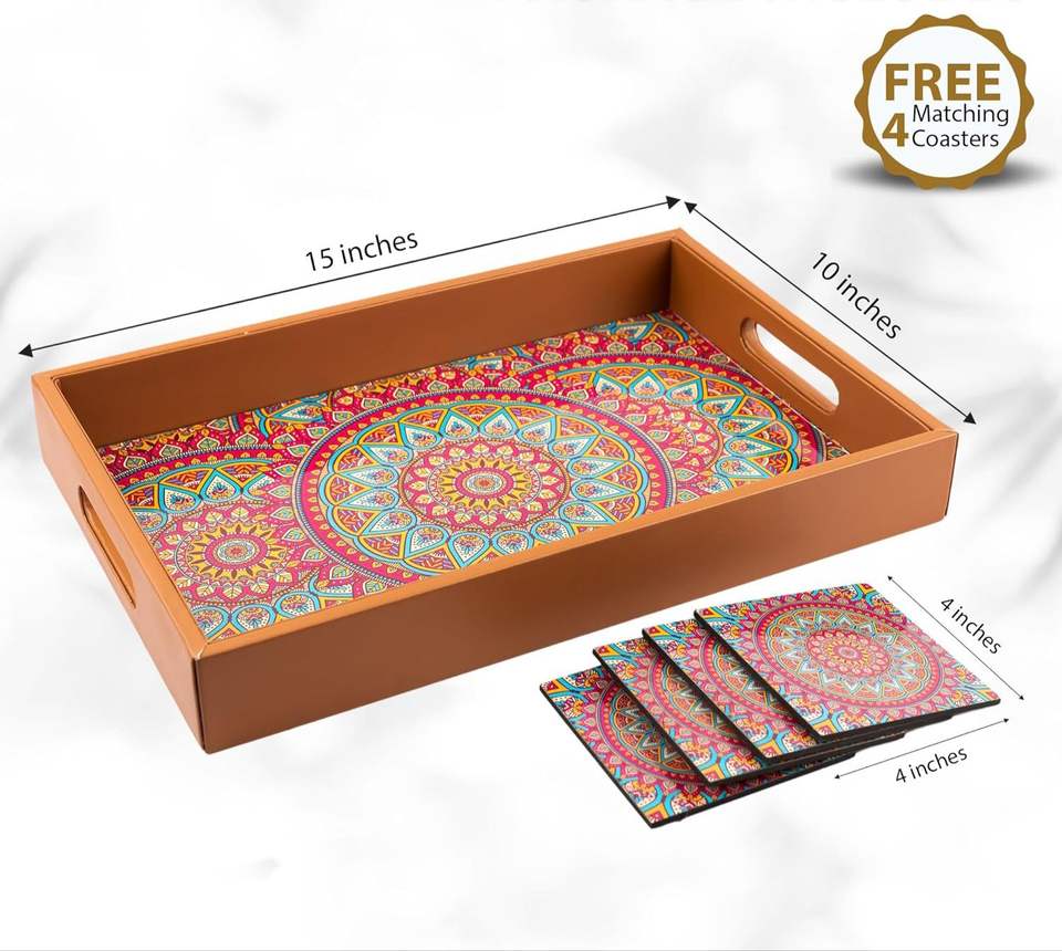 ถาดไม้ MDF 10 "x 15" ทำด้วยมือถาดรองแก้ว4ถาดสำหรับตกแต่งวาดด้วยมือพร้อมงานฝีมือ