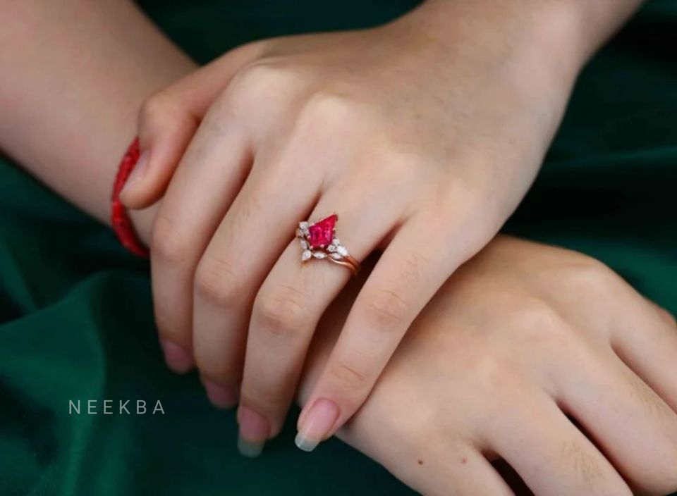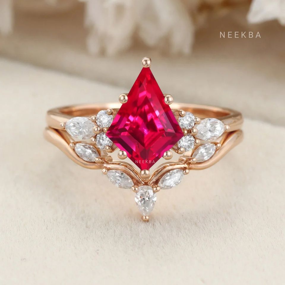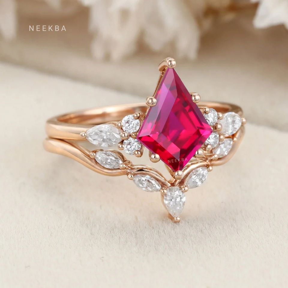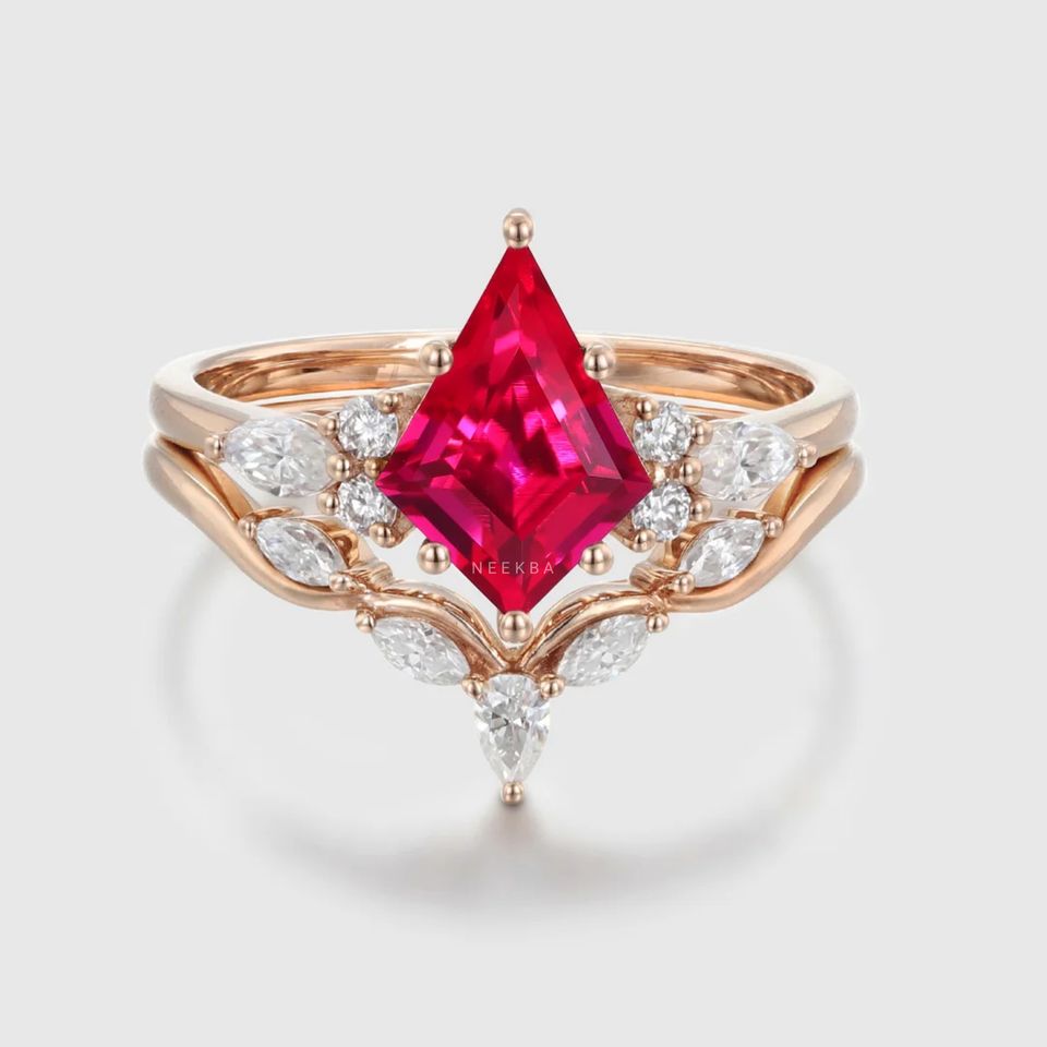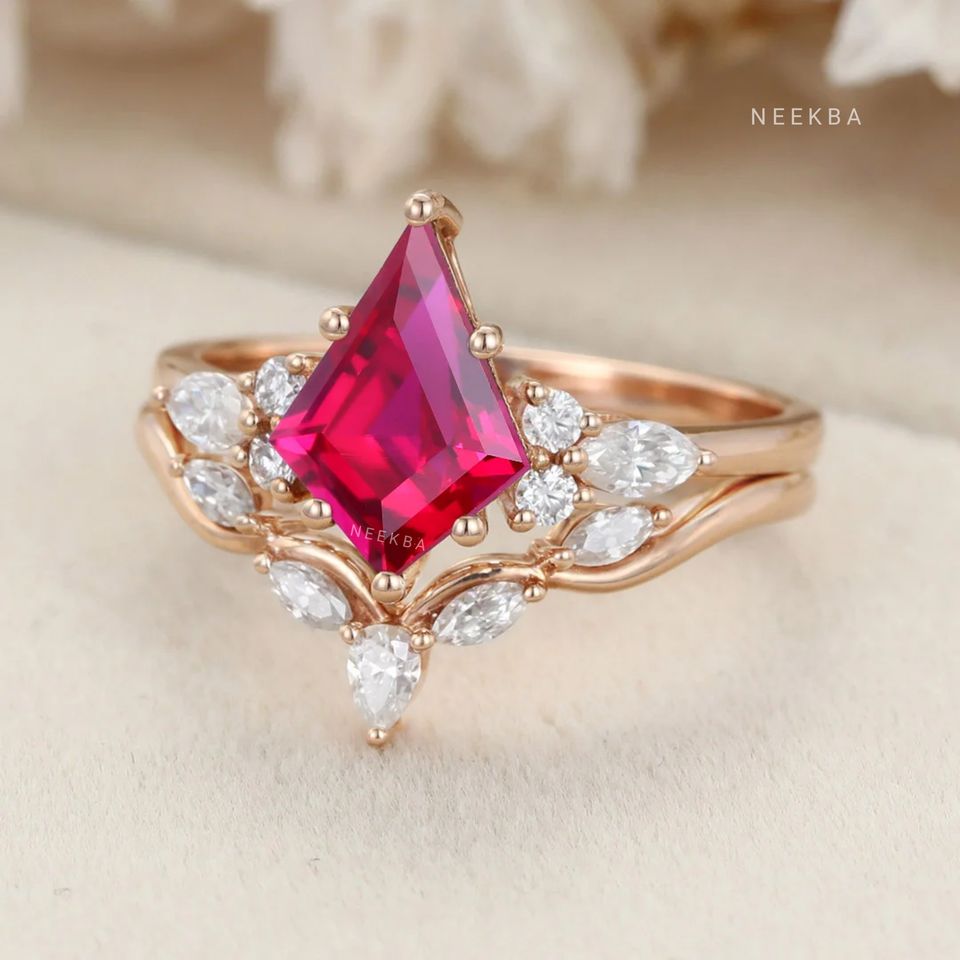 Handcrafted 10K Solid Rose Gold Luxury Ruby Jewelry, Kite Cut Ruby Engagement Ring Paired with Contour Moissanite Wedding Band
