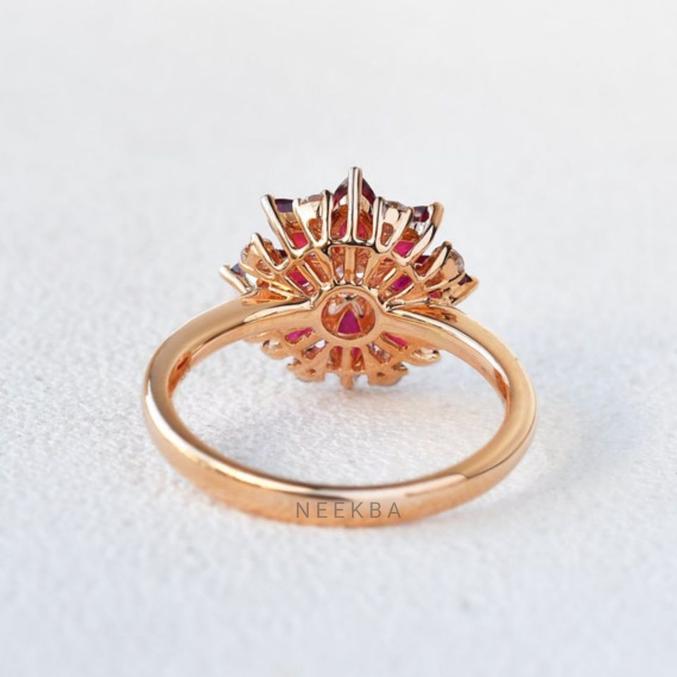 แหวนหมั้นทองสีเหลืองทึบ10K ทำด้วยมือรูปทรงมาร์คีสรูปมีพลอยลายดอกไม้ทับทิมตัวเลือกสำหรับเปลี่ยน