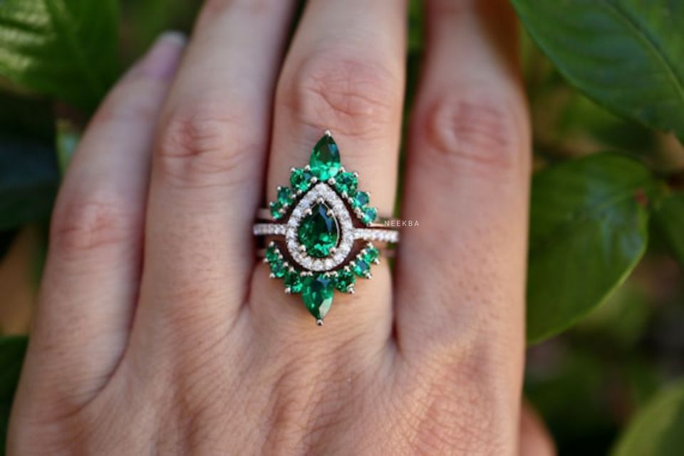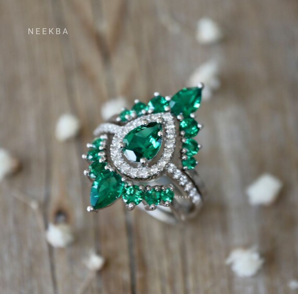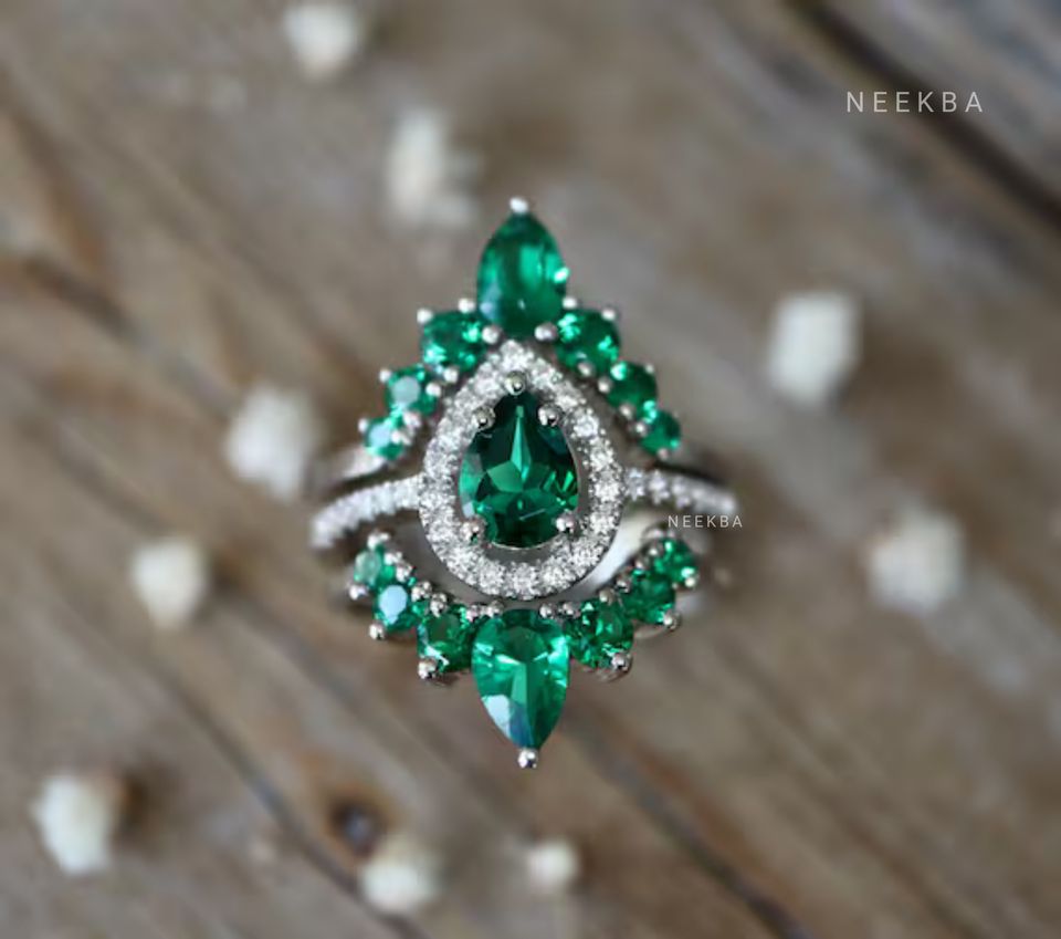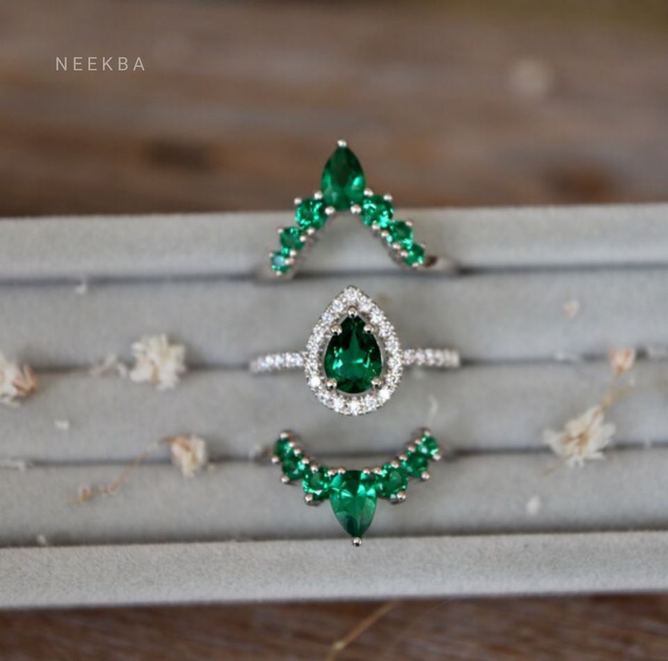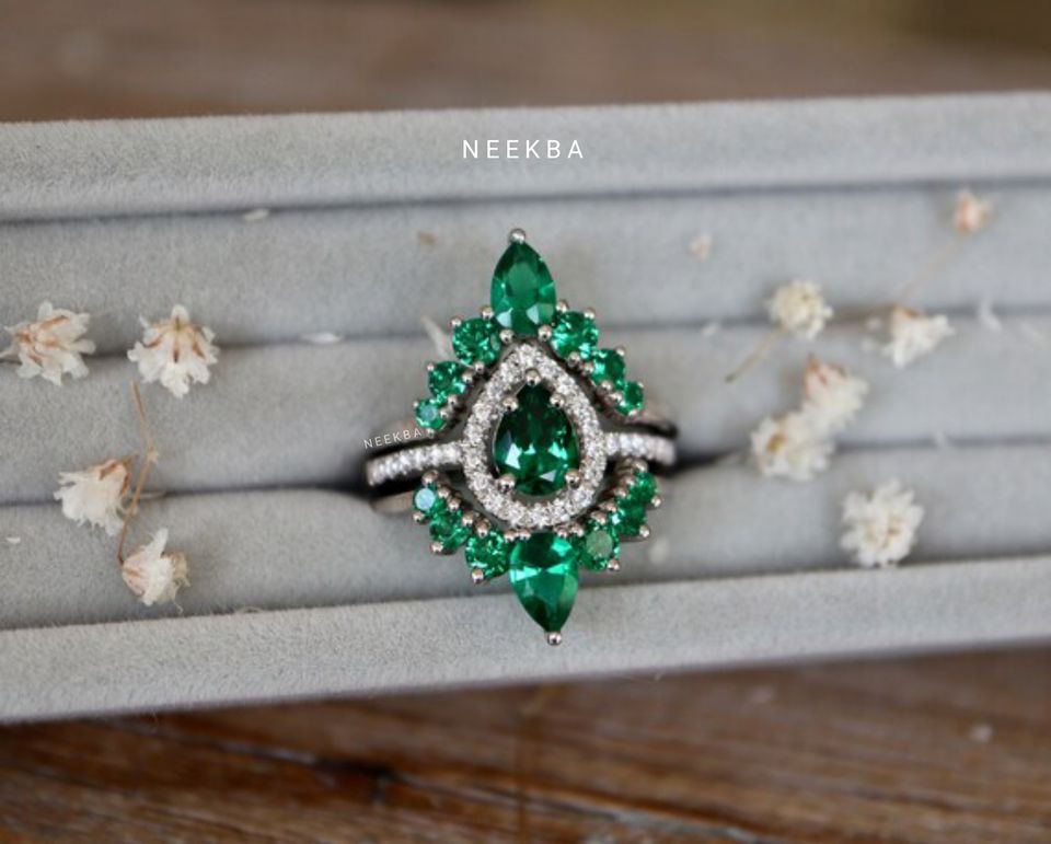 ชุดแหวนเจ้าสาว3ชิ้นสีทองขาว14K ทำด้วยมือ-รูปลูกแพร์แหวนหมั้นมรกตและแหวนแต่งงาน