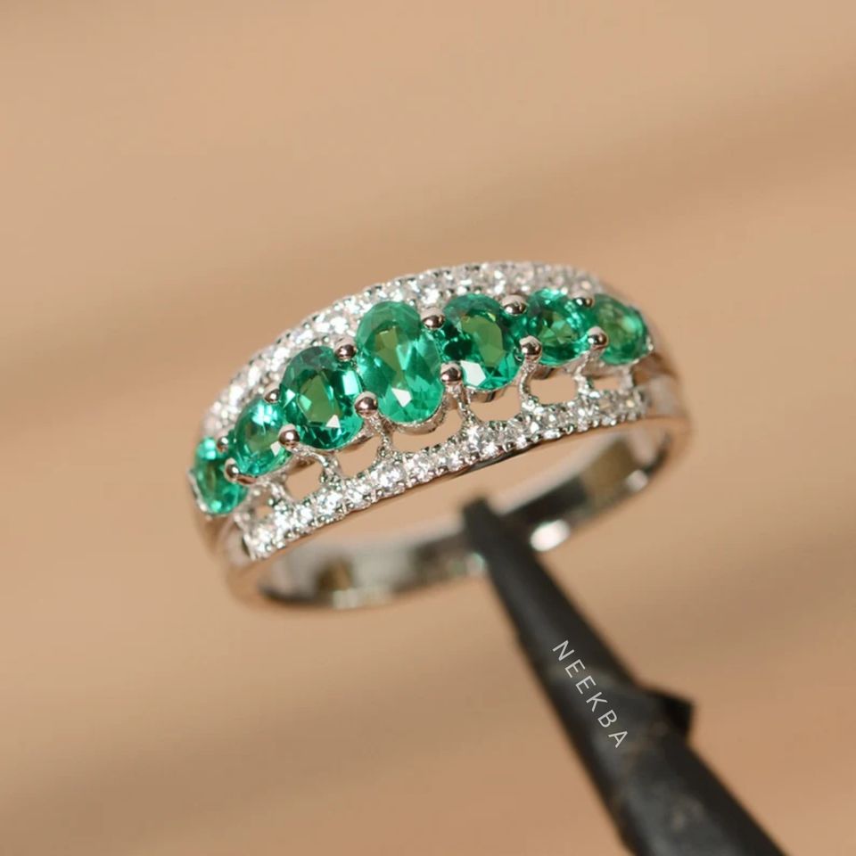แหวนมงกุฎทองคำสีขาวทึบ14K ทำด้วยมือแหวนหินหลายชั้นสีเขียวทรงวงรีแหวนทองมรกตจากอินเดีย
