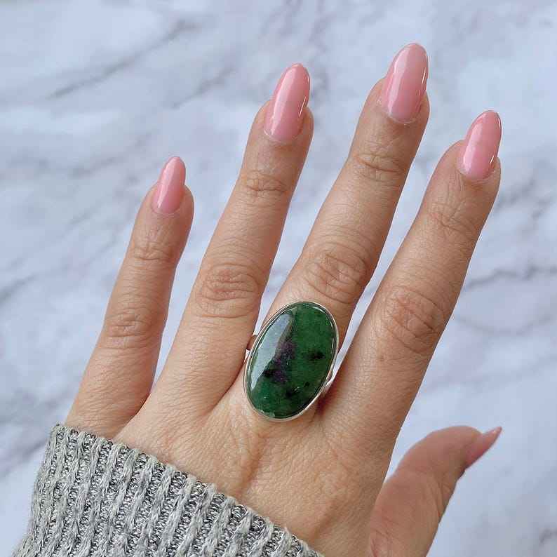 แหวนเงินแท้925ทำด้วยมือปรับได้ของขวัญเครื่องประดับที่หรูหราสำหรับงานแต่งงานพลอยทับทิมซูไซต์ดีไซน์รูปวงรีไม่ซ้ำใคร