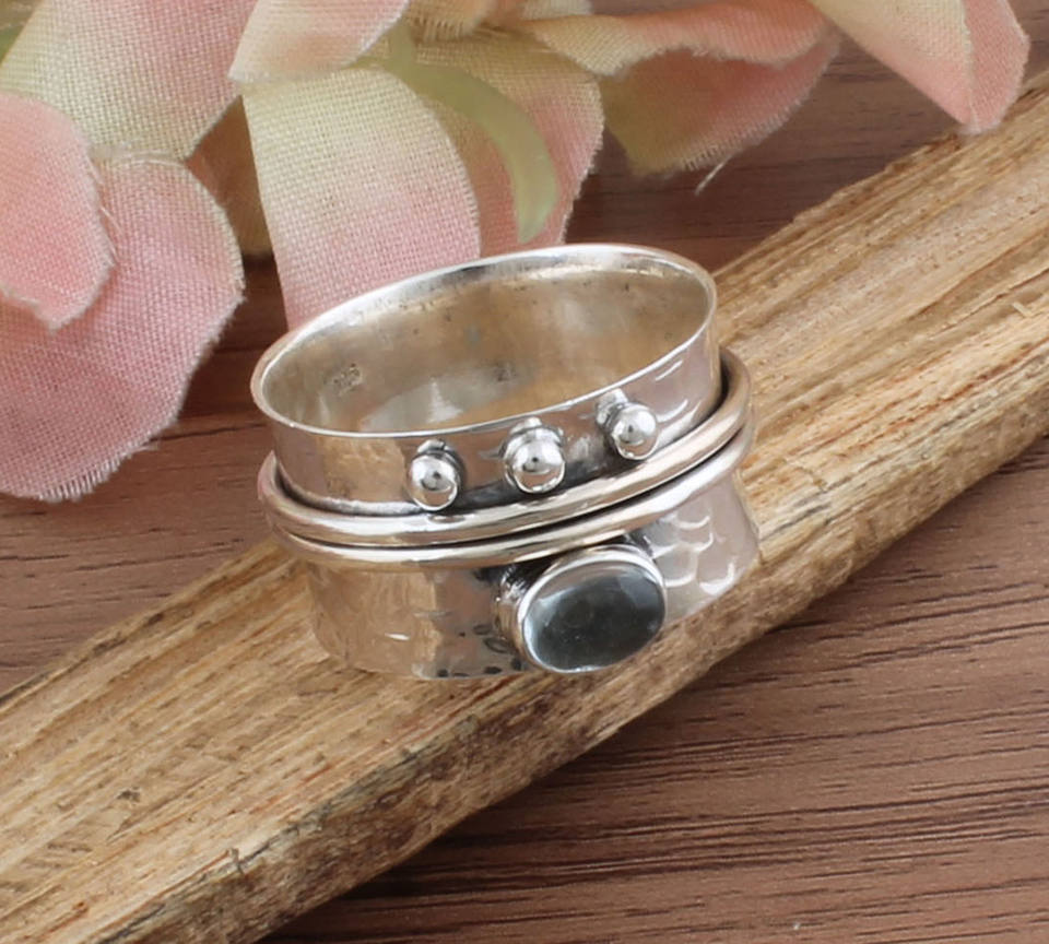 Handcrafted 925 Sterling Silver Spinner Ring with Hammered Finish Statement Meditation Ring with Aquamarine Gemstone Ring