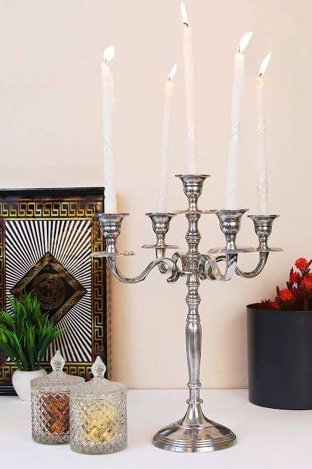 เชิงเทียนอะลูมิเนียมทำมือ ขัดเงาอย่างดี ชุบนิกเกิล 5 แขน สำหรับตกแต่งบ้าน งานแต่งงาน ขนาดปรับแต่งได้
