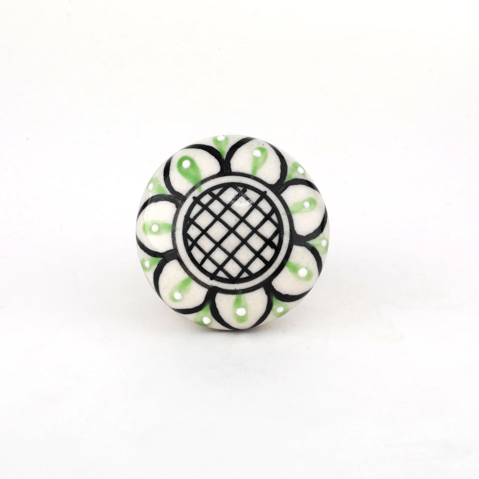 ลูกบิดลิ้นชักกลมเซรามิกสีขาวแบบโบราณทำด้วยมือพร้อมลายดอกไม้สีเขียวสำหรับตู้และตู้เสื้อผ้า