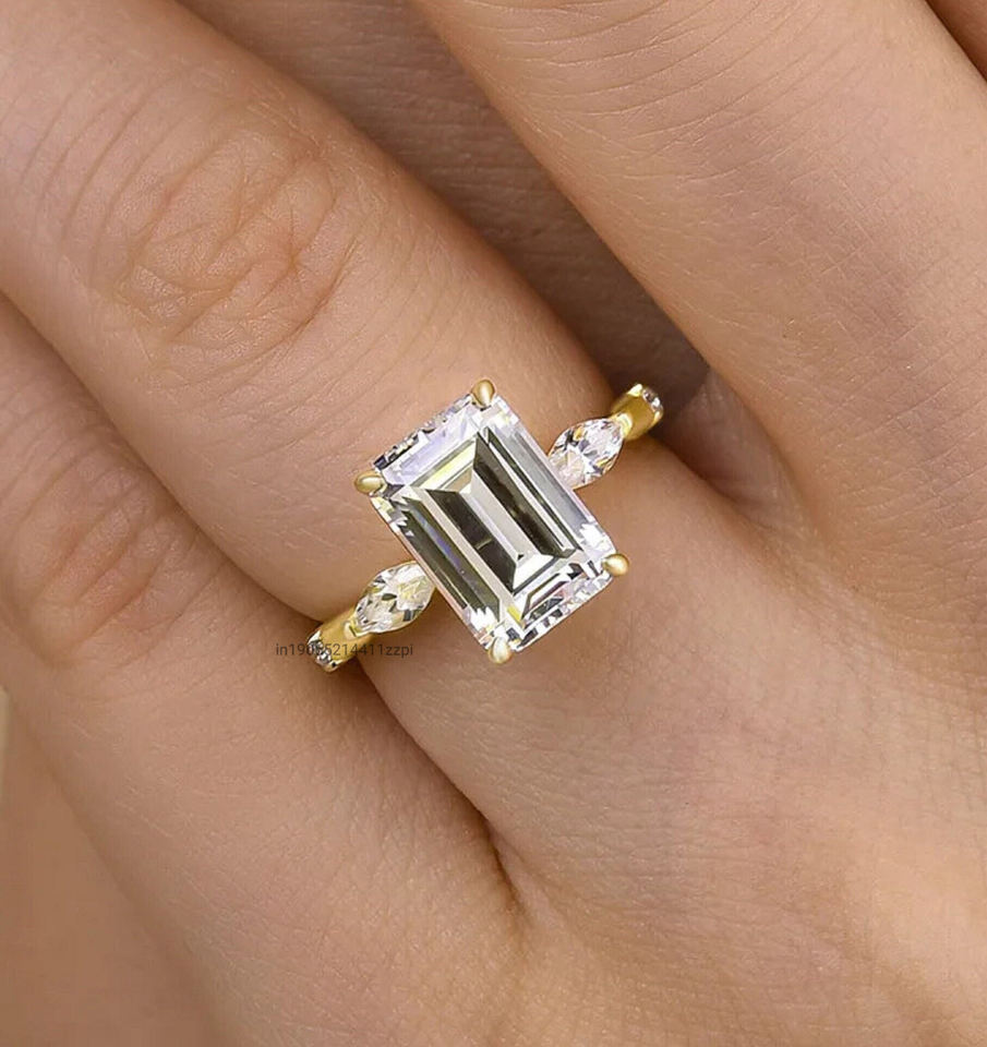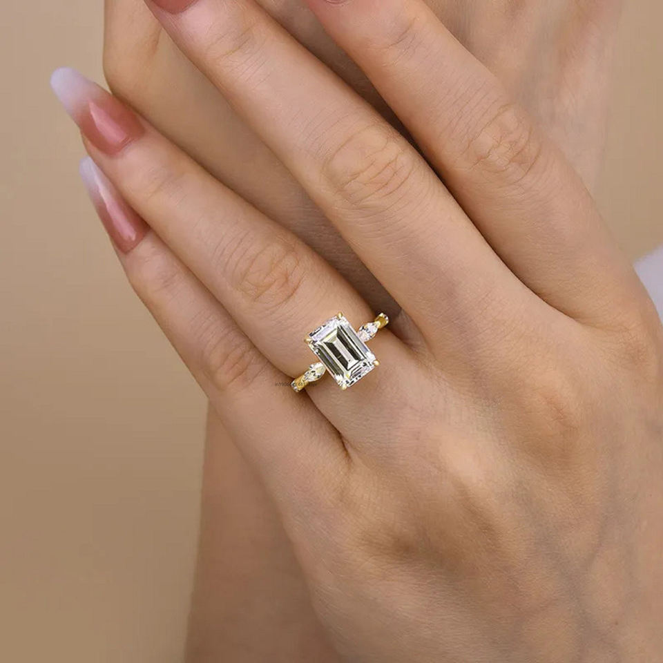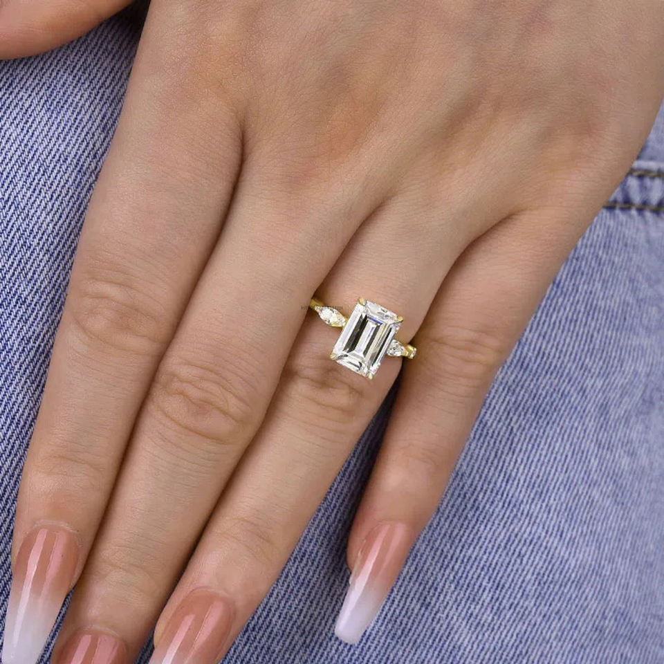 แหวนแต่งงานเพชรโมอิสสีเงิน925ประดับด้วยพลอยสีเขียวมรกตงานศิลป์ทำมือประดับด้วยพลอยสองจุดแปดกะรัตและมีสำเนียงลอยน้ำ