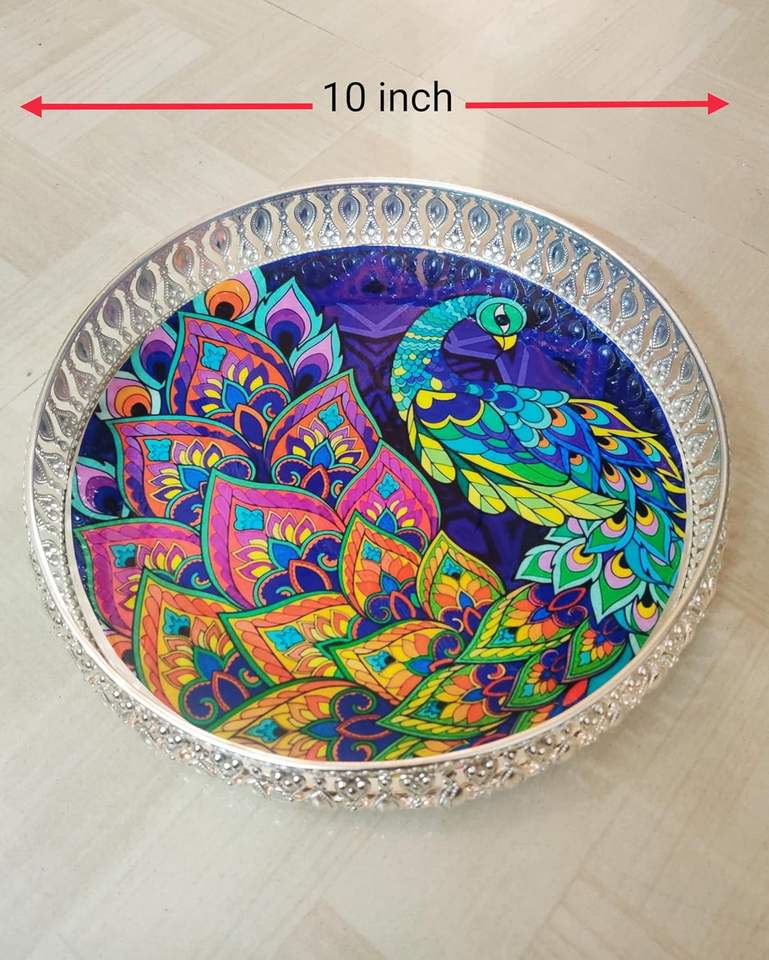 ถาดโลหะเงินเยอรมันพิมพ์ลายนกยูงที่สวยงามทำด้วยมือวัสดุคุณภาพสูงสไตล์อาร์ตเดคโคสำหรับตกแต่งบ้านงานแต่งงาน