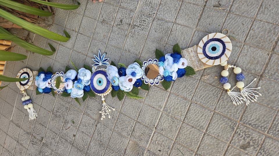 พวงประดับประตูรูปดอกไม้สีน้ำเงินลายตาปีศาจ ทำด้วยมือ พร้อมกระจกตกแต่งและพู่ประดับมุก เหมาะสำหรับตกแต่งบ้านในเทศกาลและเป็นของขวัญ