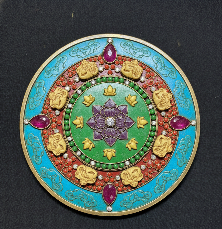 งานประติมากรรมโลหะหล่อแบบทิเบตทรงกลม ประดับลายแมนดาลา ทำจากทองเหลืองขึ้นรูปด้วยมือ พร้อมพลังงานบำบัด จากเมืองเดลี