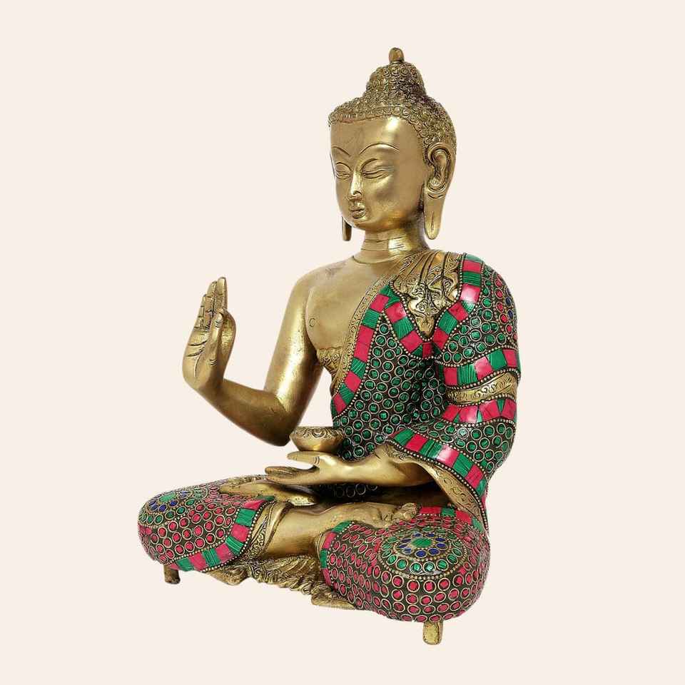 รูปปั้นพระพุทธรูปทำด้วยมือทองเหลืองฝังสีสันสดใสรูปพระพุทธเจ้ารูปพระพุทธรูปบำบัดสำหรับตกแต่งบ้านและวาสตู