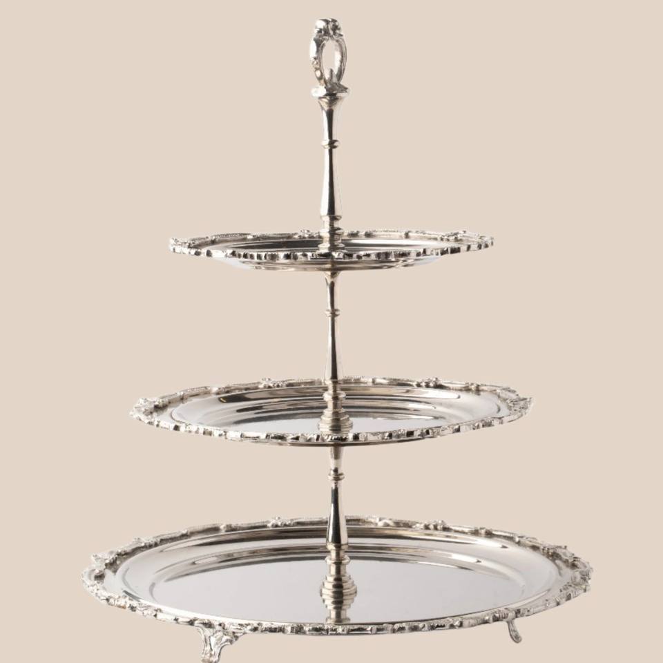 ขาตั้งเค้กสองชั้นทำมือจากทองเหลือง พร้อมจานสลักลายดอกไม้และห่วงจับทรงวงแหวน สำหรับจัดแสดงขนมหวาน งานแต่งงาน และตกแต่งบ้าน