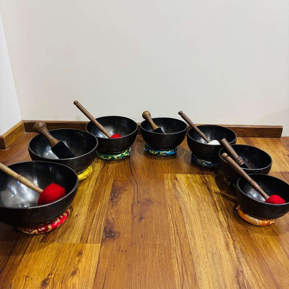 ชามเสียงโลหะบรอนซ์ทำด้วยมือพร้อมชุดจักระ7ชุดแบบดั้งเดิมสำหรับการทำสมาธิทุกวันและการฝึกศาสนาพุทธส่วนบุคคล