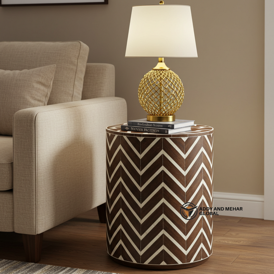โต๊ะข้างเตียงไม้ทรงกลมสีน้ำตาลลายก้างปลาฝังกระดูก งานแฮนด์เมดสไตล์โมเดิร์นสุดหรู