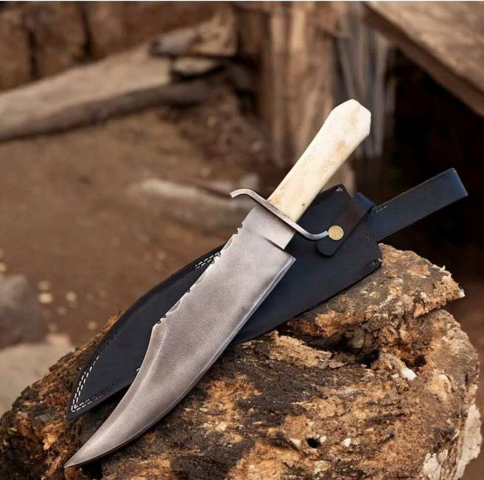 มีดโบวี่เหล็กกล้าคาร์บอนทำมือ ด้ามจับกระดูกอูฐ ใบมีดแข็งแรงทนทาน พร้อมปลอกหนัง