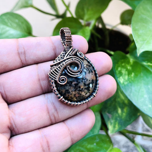จี้หินธรรมชาติสำหรับสร้อยคอ Dalmatian Jasper,จี้หินสไตล์โบฮีเมียนทรงกลมทำจากลวดทองแดง