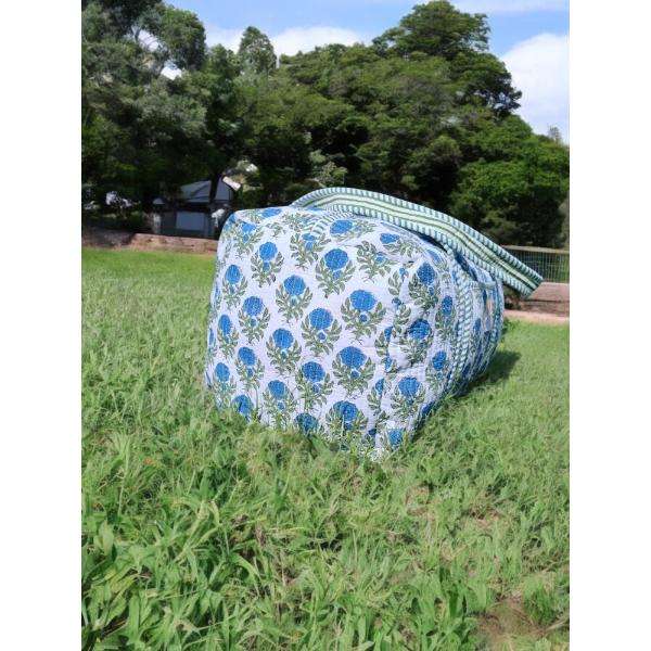 กระเป๋าผ้าฝ้ายเย็บมือแบบดัฟเฟิล น้ำหนักเบา ทนทาน ภายในกว้างขวาง พร้อมลายพิมพ์บล็อกสวยงาม เหมาะสำหรับการเดินทาง