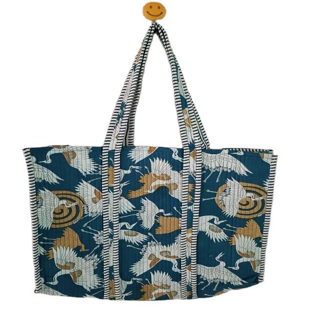 กระเป๋าผ้าฝ้ายพิมพ์ลายนกกระเรียนทำมือ พับเก็บได้ น้ำหนักเบา สายสะพายยาว ใช้ซ้ำได้ เหมาะสำหรับผู้หญิง ใช้เดินทางหรือไปชายหาด