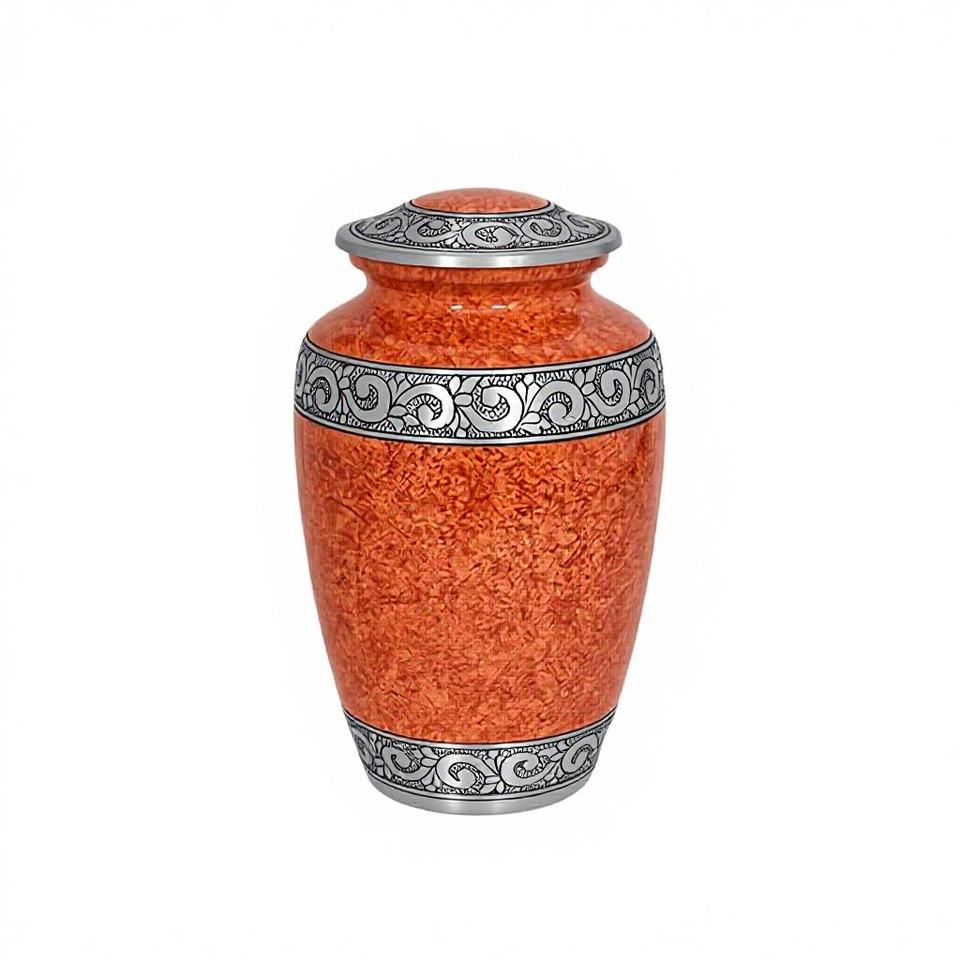 โกศบรรจุอัฐิทำมือจากโลหะแข็งสีส้มสนิม โกศสำหรับผู้ใหญ่สีส้มคลาสสิก พร้อมแถบสีเงินและถุงกำมะหยี่