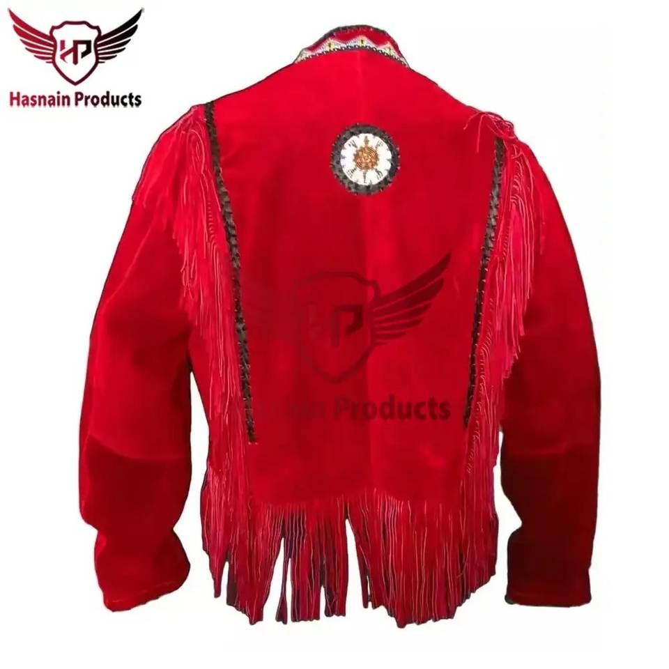 แจ็กเก็ตหนังกลับสีแดงทำด้วยมือสำหรับผู้ชายเสื้อโค้ทคาวบอยติดขอบกับด้านลูกปัดแนวสตรีทตะวันตกไม่เหมือนใคร