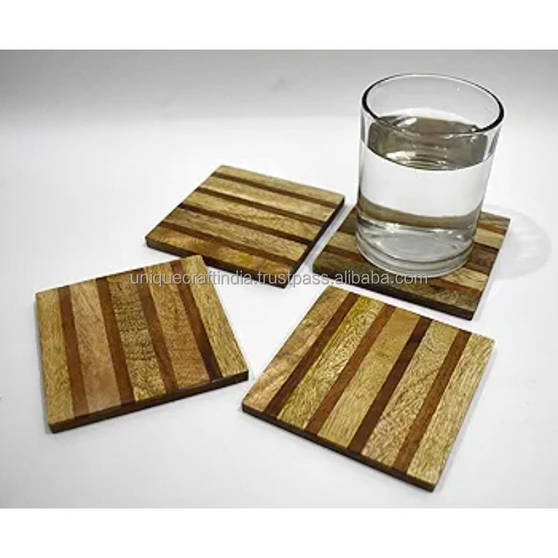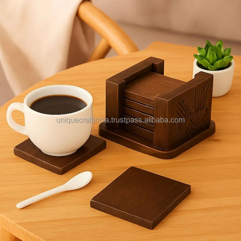 ชุดจานรองแก้วไม้สีเข้มทำมือ พร้อมที่วาง ดีไซน์เรียบหรูสำหรับตกแต่งโต๊ะ ลายเส้นมินิมอล แผ่นรองแก้วหนา 5 มม. สไตล์คลาสสิก