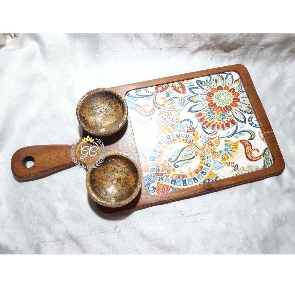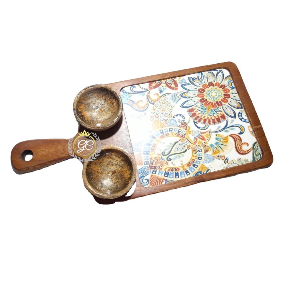 Handcrafted Eco-Friendly Acacia Wood Chip Dip Serving Platter Wooden Appetizer Tray Integrated Bowl for Parties Entertaining