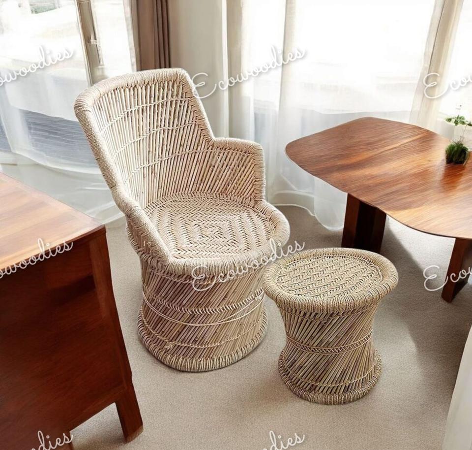 ชุดเก้าอี้สตูลและเก้าอี้ทำจากไม้ไผ่ผ้าซาร์คันดาออตโตมันที่ทำด้วยมือและเป็นมิตรต่อสิ่งแวดล้อม
