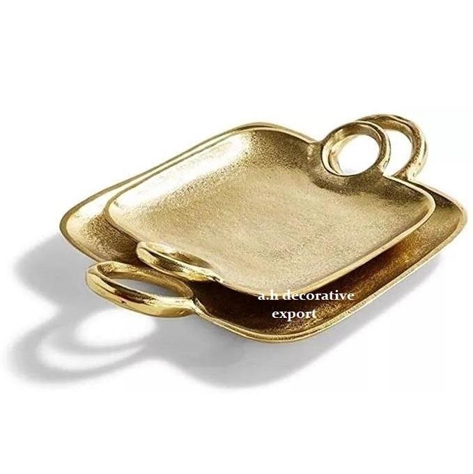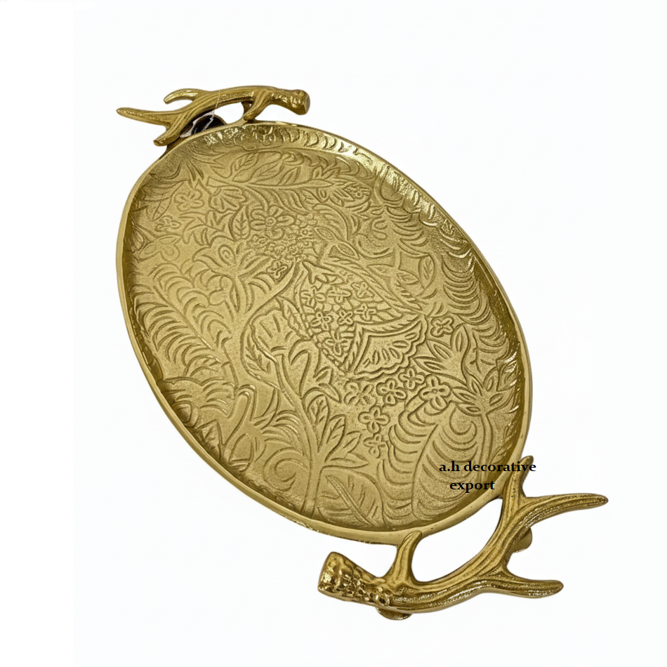 ถาดโลหะสีทองลายแกะสลักด้วยมือ พร้อมหูจับลายเขากวาง เป็นมิตรกับสิ่งแวดล้อม ใช้กับเครื่องล้างจานได้ ของตกแต่งสไตล์วินเทจสำหรับโต๊ะกาแฟ