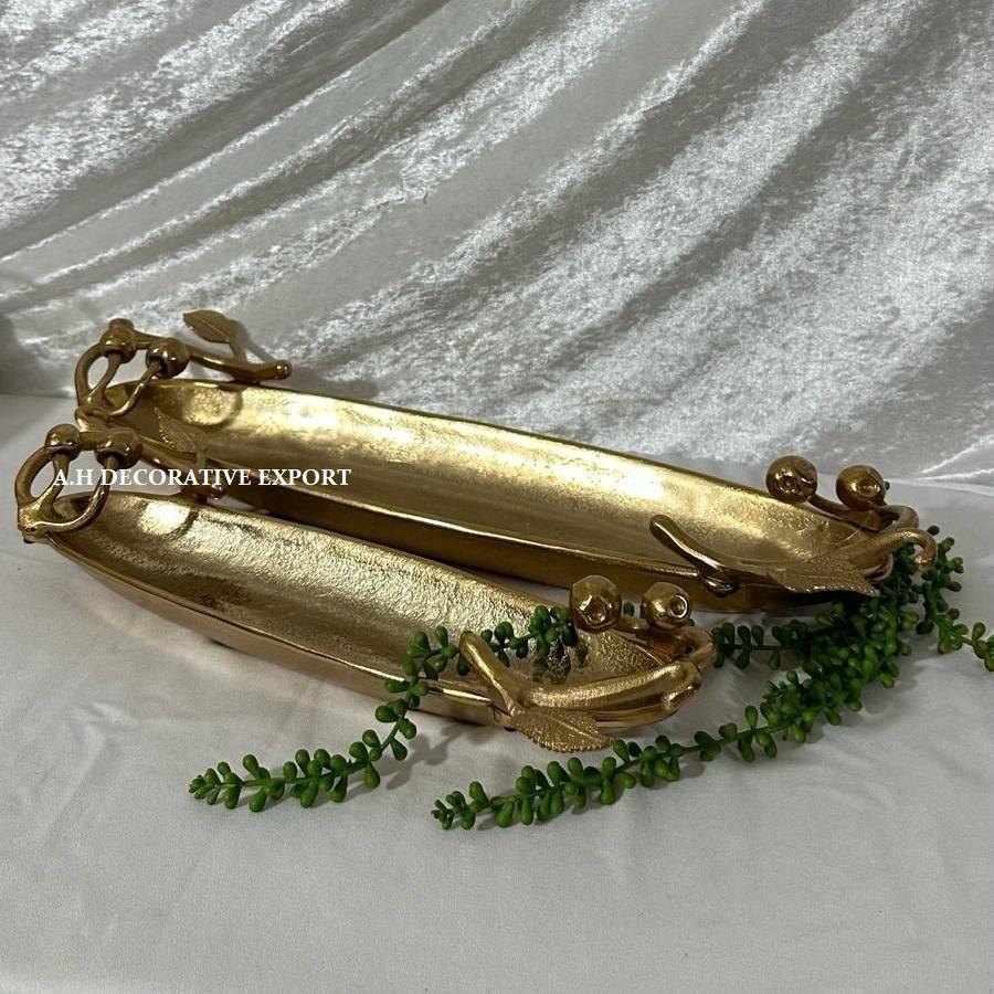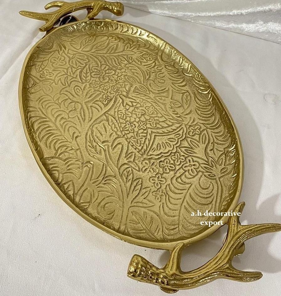 ถาดโลหะสีทองลายแกะสลักด้วยมือ พร้อมหูจับรูปเขากวาง สำหรับตกแต่งโต๊ะกาแฟ สไตล์โมเดิร์น ของขวัญพรีเมียม