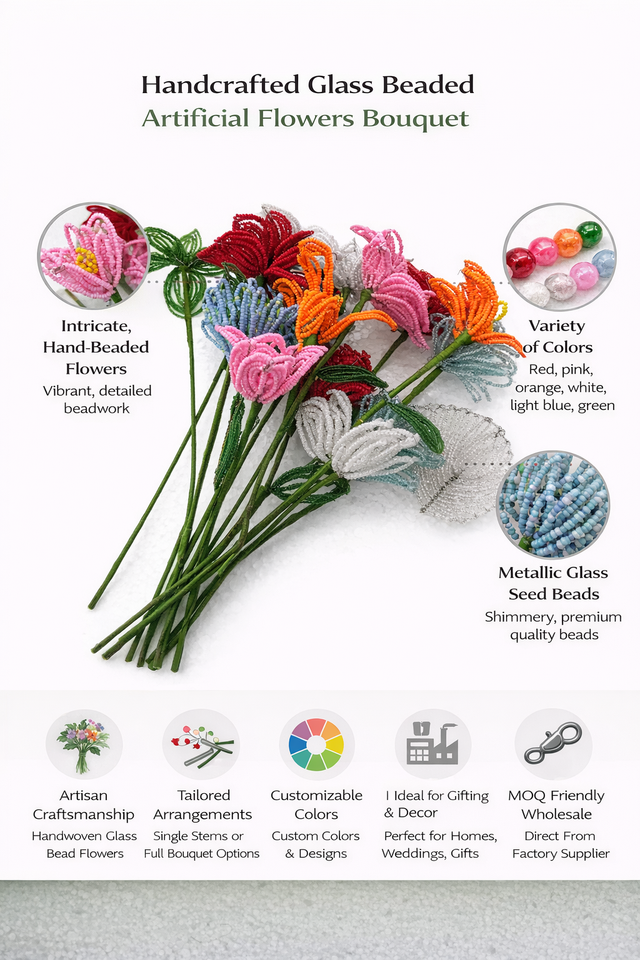 ช่อดอกไม้ประดิษฐ์ประดับลูกปัดแก้วทำมือ ก้านดอกไม้ประดับลูกปัดเม็ดเล็ก สำหรับตกแต่งบ้านและเป็นของขวัญ