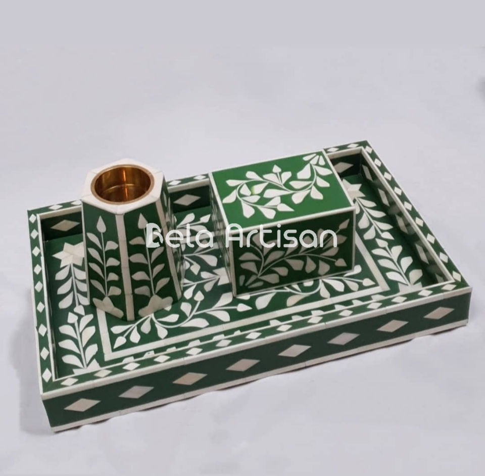 ชุดเตา bakhoor ฝังกระดูกสีเขียวทำมือถาดทรงสี่เหลี่ยมลายดอกไม้พร้อมชามทองเหลืองและกล่องเก็บของสำหรับตกแต่งบ้าน