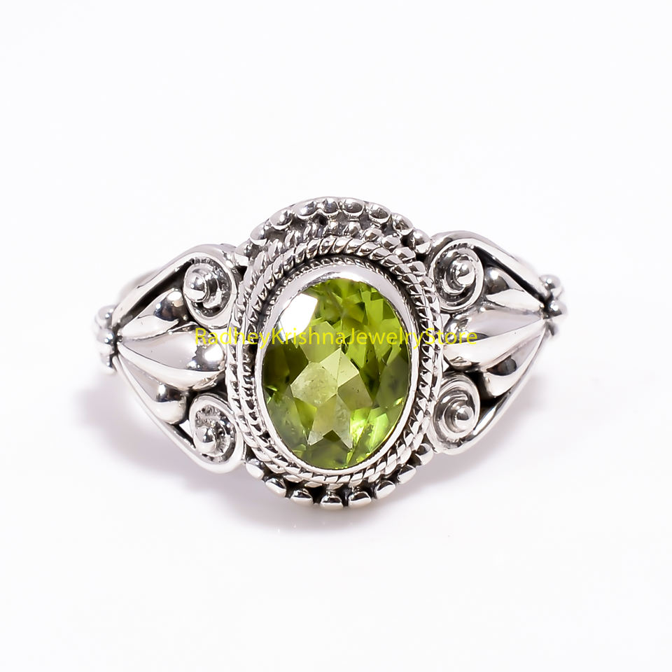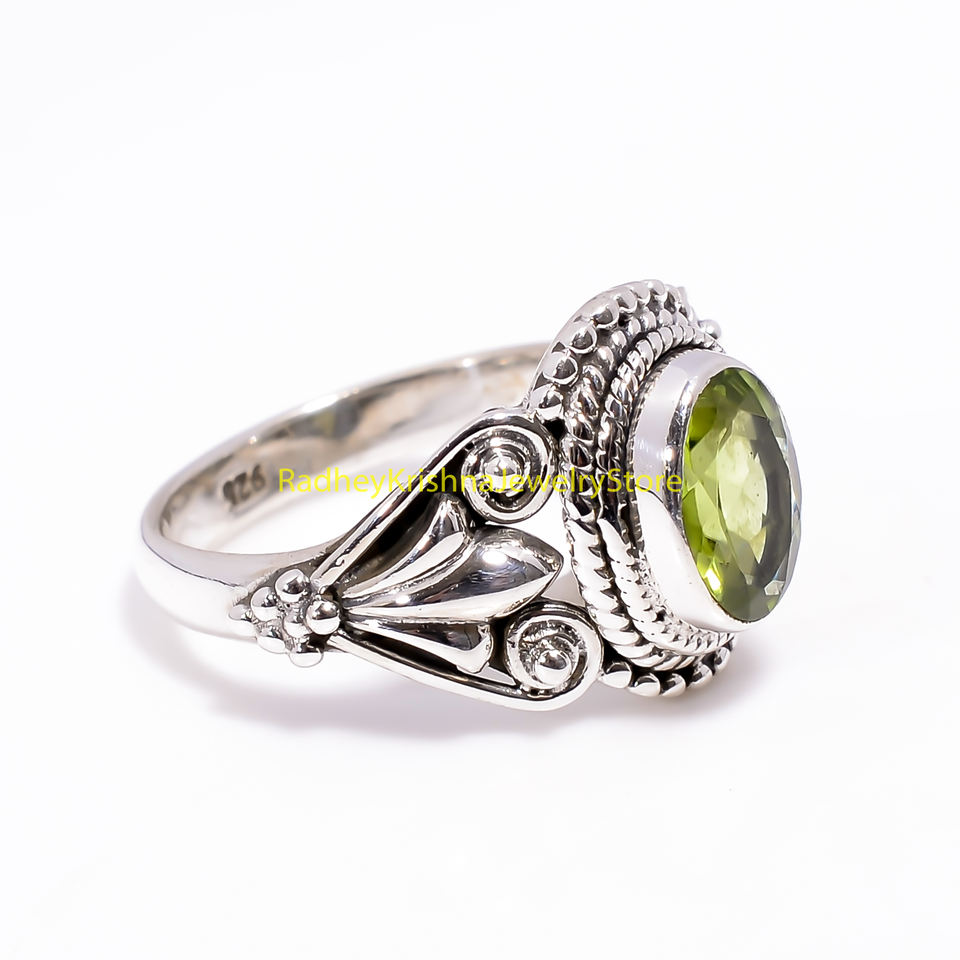 แหวนเงินลายฉลุวินเทจประดับเพอริดอทสีเขียวทำมือ