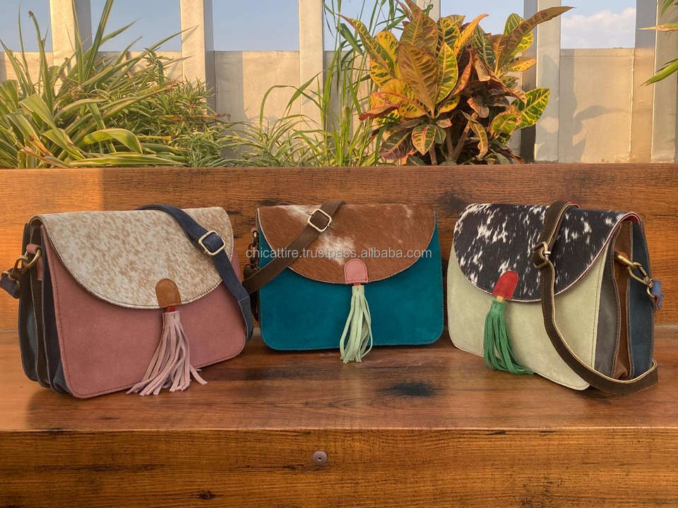 Handcrafted Hair on Cowhide Colorful Suede Leather Crossbody Shoulder Bags for Women Sustainable Recycled Leather Tassel Handbag