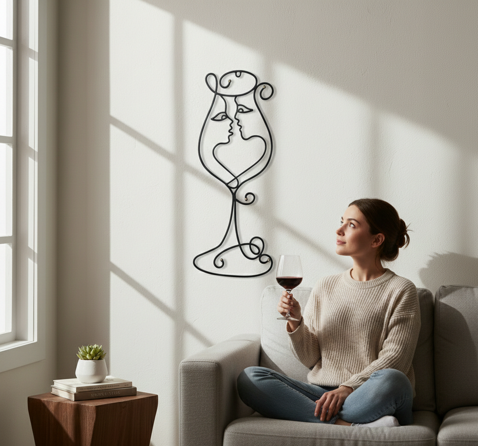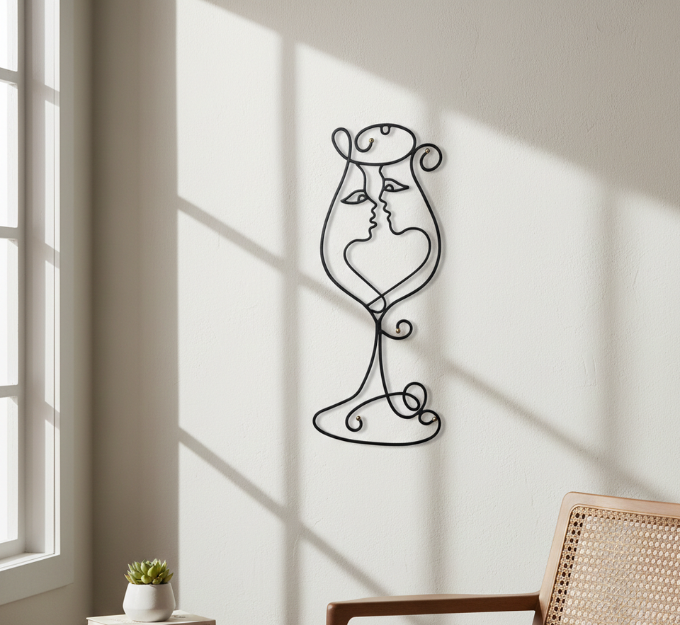 งานศิลปะติดผนังเหล็กดัดทำมือ รูปแบบโรแมนติกที่เชื่อมต่อกันอย่างลงตัวภายในแก้วไวน์สุดหรู เหมาะสำหรับของขวัญขึ้นบ้านใหม่