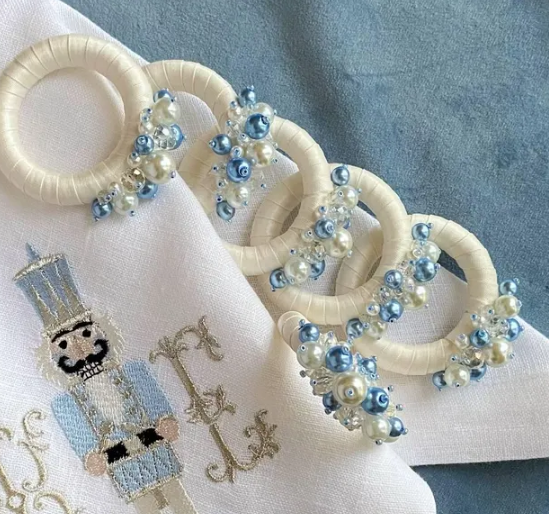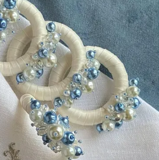 แหวนผ้าเช็ดปากงาช้างทำด้วยมือมีไข่มุกสีฟ้าและสีขาว