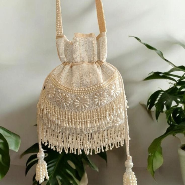 กล่องเครื่องประดับแก้วทำมือ กระเป๋าผ้าโพลีแบบดั้งเดิมสำหรับงานแต่งงานกลางแจ้ง ลายดอกไม้ พร้อมพู่ห้อย