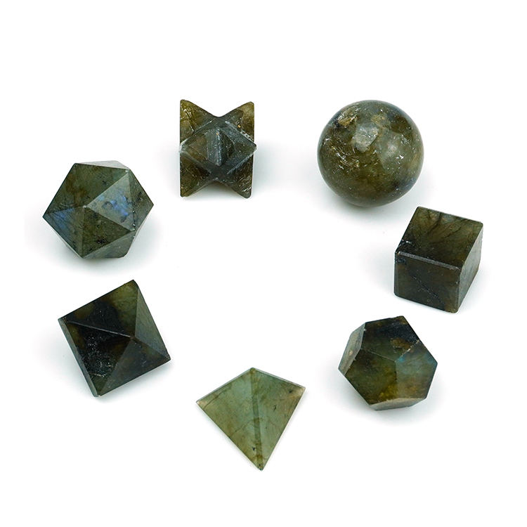 ชุดคริสตัลทรงเรขาคณิตศักดิ์สิทธิ์ของลาบราดอไรต์ที่ทำด้วยมือ (7ชิ้น) | ชุดผลึกแข็ง7เม็ดรูปทรงเรขาคณิตของลาบราดอไรต์