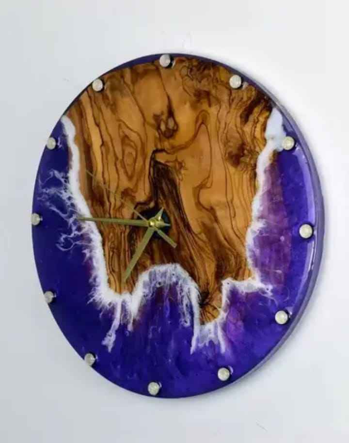 นาฬิกาแขวนผนังไม้มะกอกขอบธรรมชาติ งานแฮนด์เมด ประดับด้วยเรซิ่นสามสีลายแม่น้ำ พร้อมลายฝังสีขาวมุก สีเขียวอมฟ้า และสีน้ำเงินกรมท่า