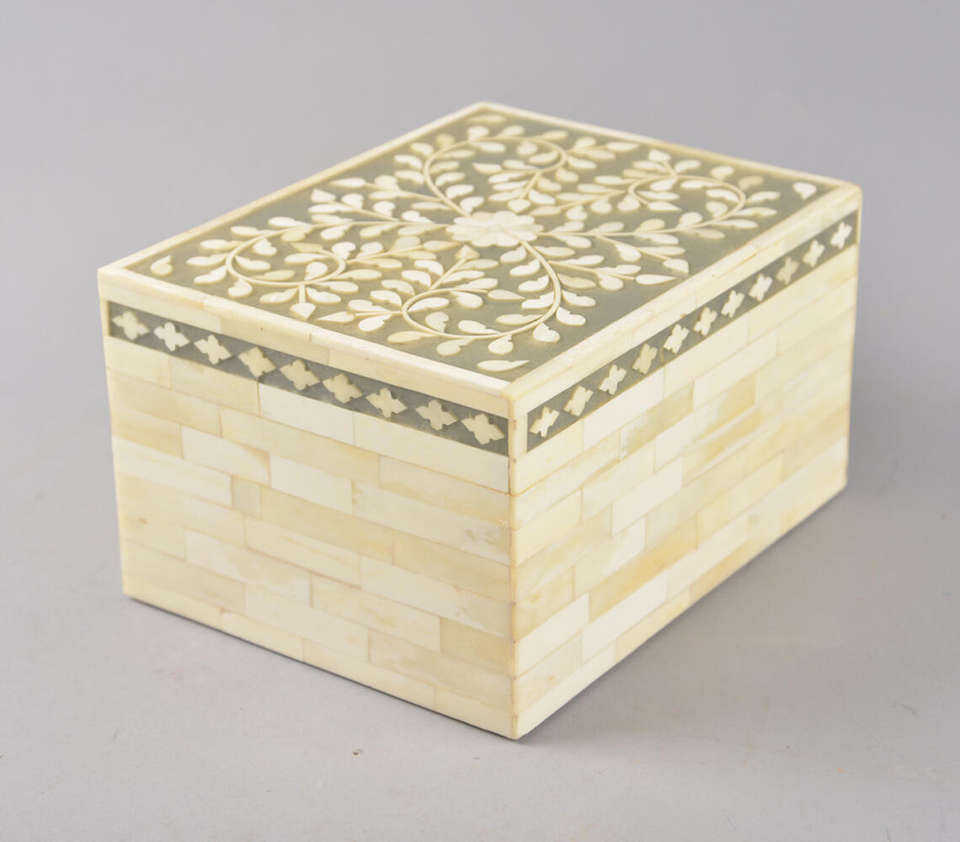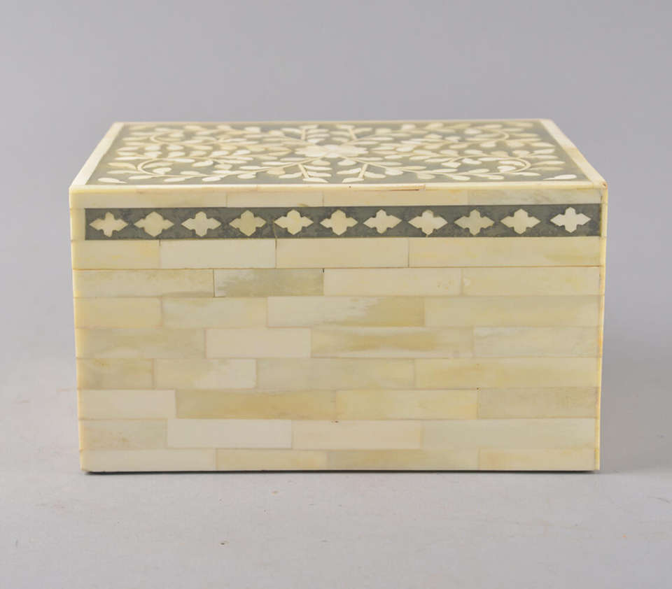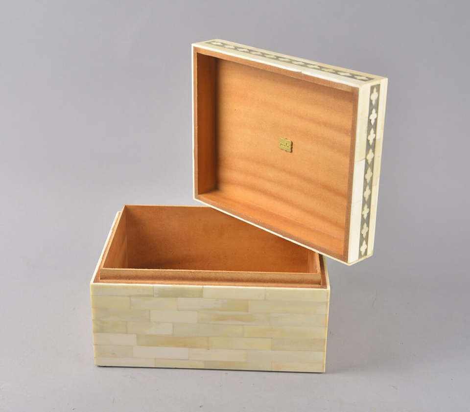 กล่องตกแต่งงานฝีมือสุดหรู ประดับด้วยลายดอกไม้สีขาวบนพื้นสีเทา รูปทรงสี่เหลี่ยมผืนผ้า