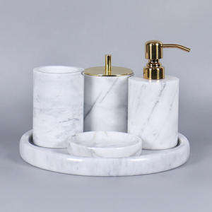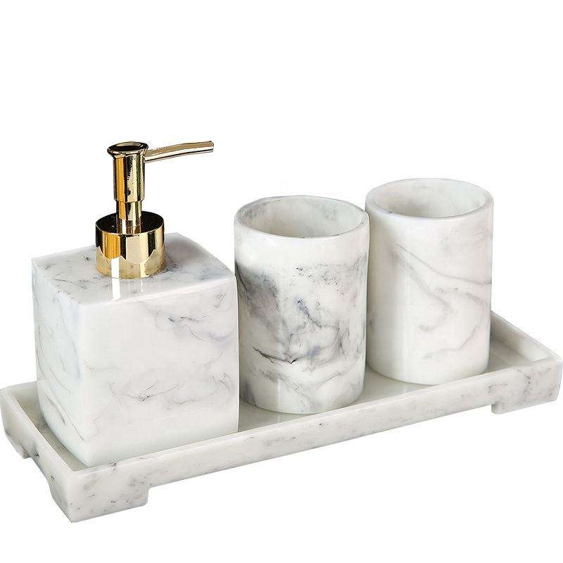 ชุดอุปกรณ์ห้องน้ำเรซิ่นหรูหราทำมือสำหรับตกแต่งบ้าน ชุดถาดใส่แก้วและที่จ่ายสบู่พรีเมียมพร้อมเคลือบเงา