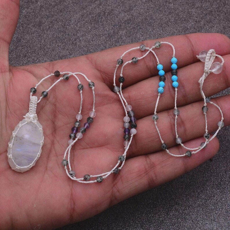 สร้อยคอหินมูนสโตนถักมือแบบมาคราเม่ เชือกสีขาว จี้ปรับได้ ประดับลูกปัด สไตล์โบโฮ เครื่องประดับคริสตัลบำบัด สำหรับผู้หญิง ของขวัญ