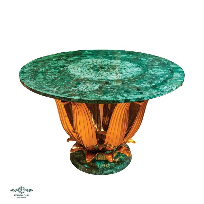 โต๊ะลายดอกบัวทำมือจากมาลาไคต์พร้อมฐานทองแกะสลัก