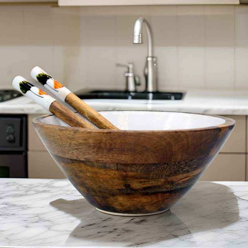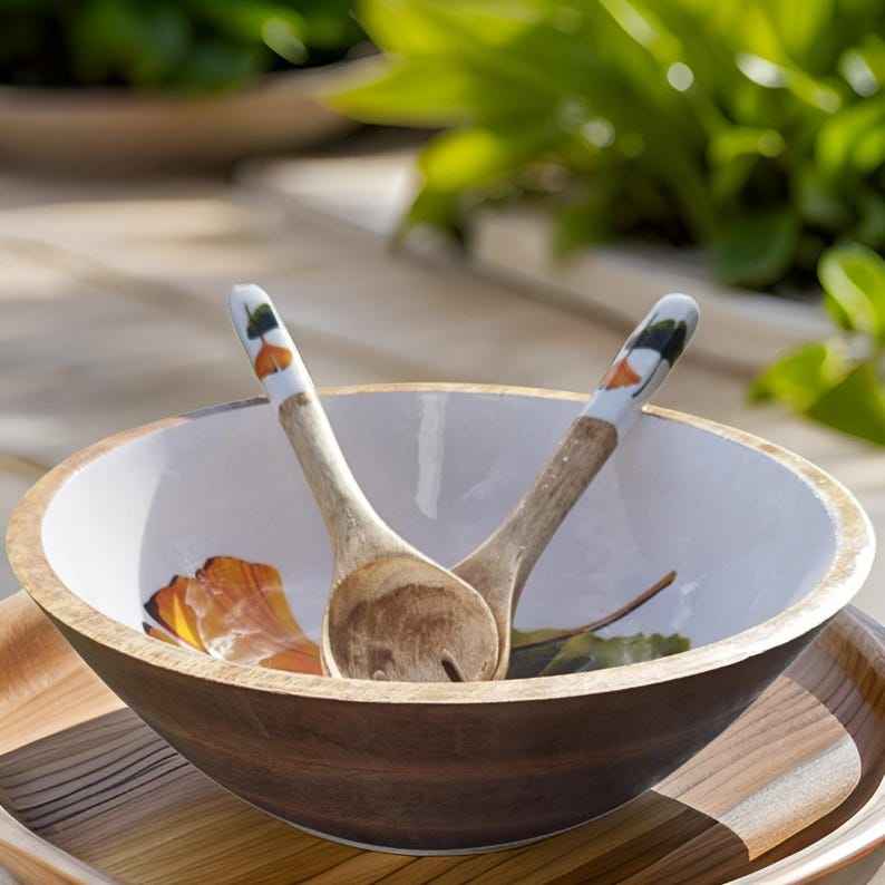 ชามสลัดไม้มะม่วงทำมือ พร้อมเคลือบลายดอกบัวสีน้ำเงินและสีขาว สำหรับเสิร์ฟอาหารที่บ้านและในครัว
