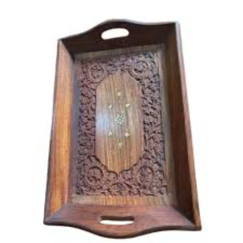 ถาดเสิร์ฟไม้มะม่วงทำมือ พร้อมงานฝังทองเหลืองแบบโมร็อกโก ถาดกาแฟตกแต่งสไตล์โบราณ ของตกแต่งบ้าน อุปกรณ์ครัว