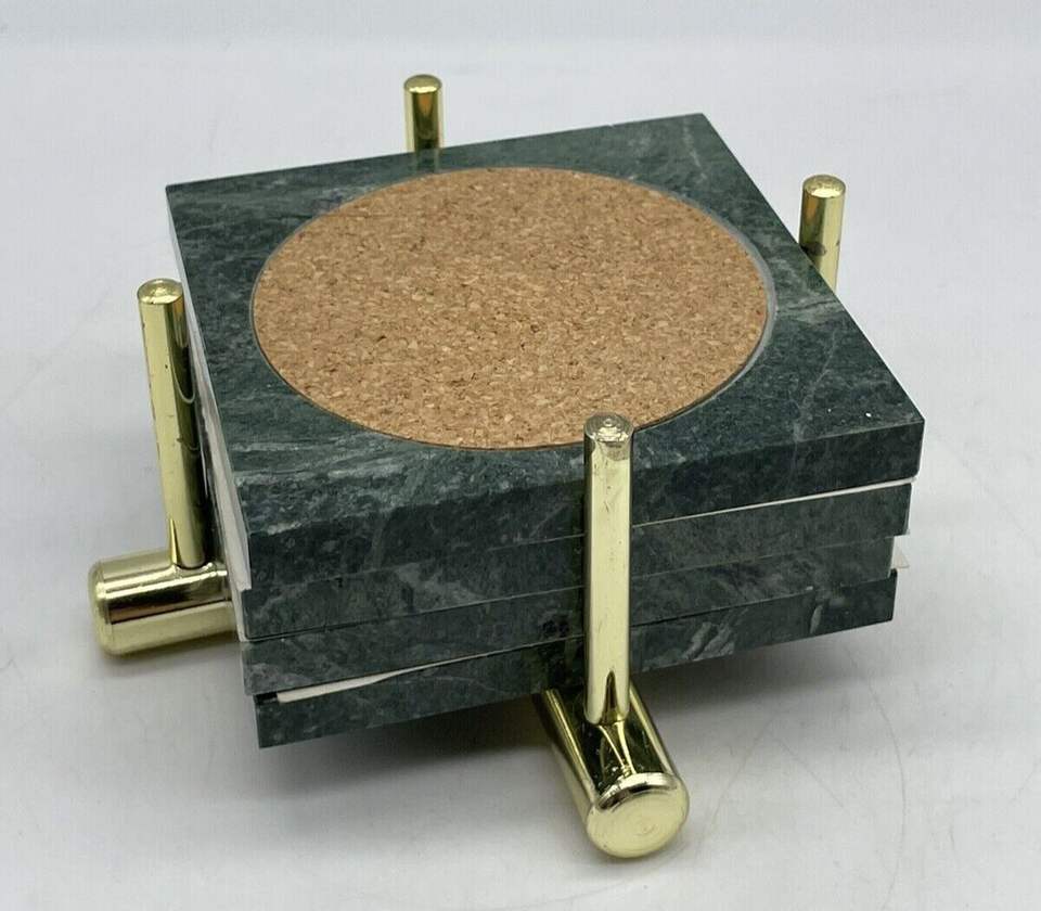 แผ่นรองแก้วหินอ่อนทำมือทรงสี่เหลี่ยมขัดเงา พร้อมที่วางแก้วแบบลวดทองเหลือง ของขวัญสุดหรูสำหรับบ้าน คาเฟ่ และบาร์